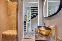 De recent vernieuwde badkamer is een ware blikvanger en ademt pure luxe. Deze stijlvolle wellnessruimte is uitgerust met een bubbelbad met jetstreams, een royale inloopdouche met zitgedeelte en plafonddouche, een verlichte nis, verwarmde spiegel en sfeervolle verlichting. Hier begin en eindig je elke dag in alle comfort. Daarnaast is er een separaat toilet, uitgevoerd in dezelfde elegante stijl als de badkamer.