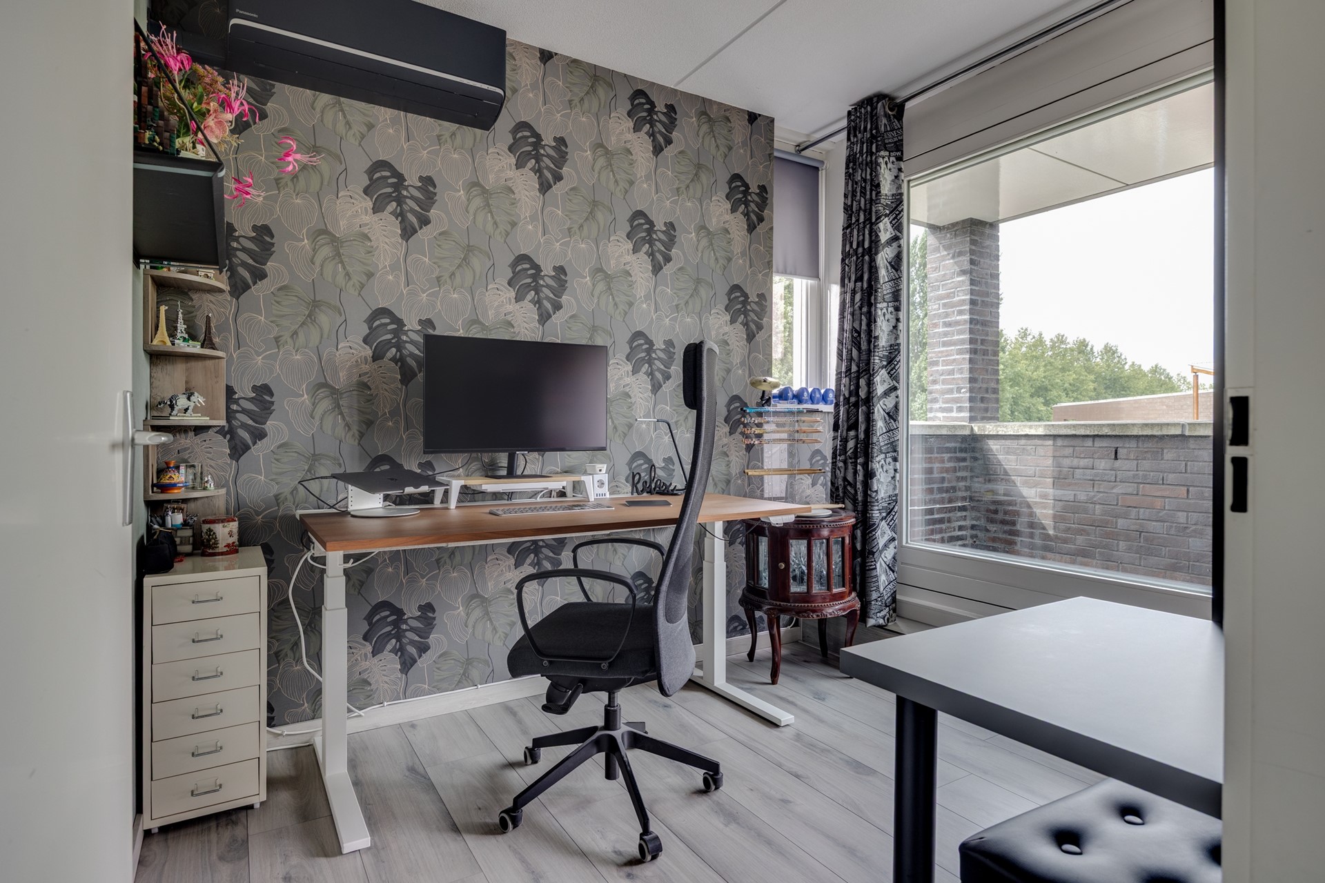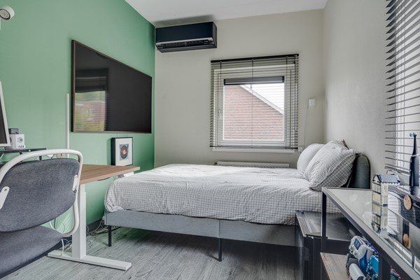 De tweede verdieping biedt verrassend veel ruimte. Hier vind je een royale vierde slaap- of werkkamer met schuifpui naar een overdekt balkon met praktische bergkast. Daarnaast is er een vijfde kamer met aansluitingen voor wasmachine en droger, evenals de opstelling van de cv-ketel en waterontharder. Ideaal als wasruimte, hobbykamer of extra bergruimte.