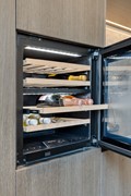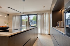 De woonkamer aan de voorzijde is royaal opgezet met brede raampartijen, strakke wanden en subtiele inbouwspots die het licht prachtig verdelen. Hier heerst rust, ruimte en verfijning. Aan de achterzijde vormt de maatwerkkeuken het stijlvolle hart van de woning – uitgevoerd in donkere houttinten met een natuurstenen blad en voorzien van topapparatuur, van Siemens, zoals een, combi-oven, wijnklimaatkast, vaatwasser, koel-/vriescombinatie, Quooker en een Bora inductiekookplaat met geïntegreerde afzuiging. Dankzij de brede pui met openslaande deuren naar het terras vloeien binnen en buiten moeiteloos in elkaar over. Het resultaat is een leefruimte waar design en dagelijks comfort elkaar versterken – een fijne plek voor gezellige diners, lange avonden met familie en vrienden.