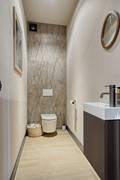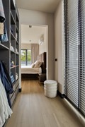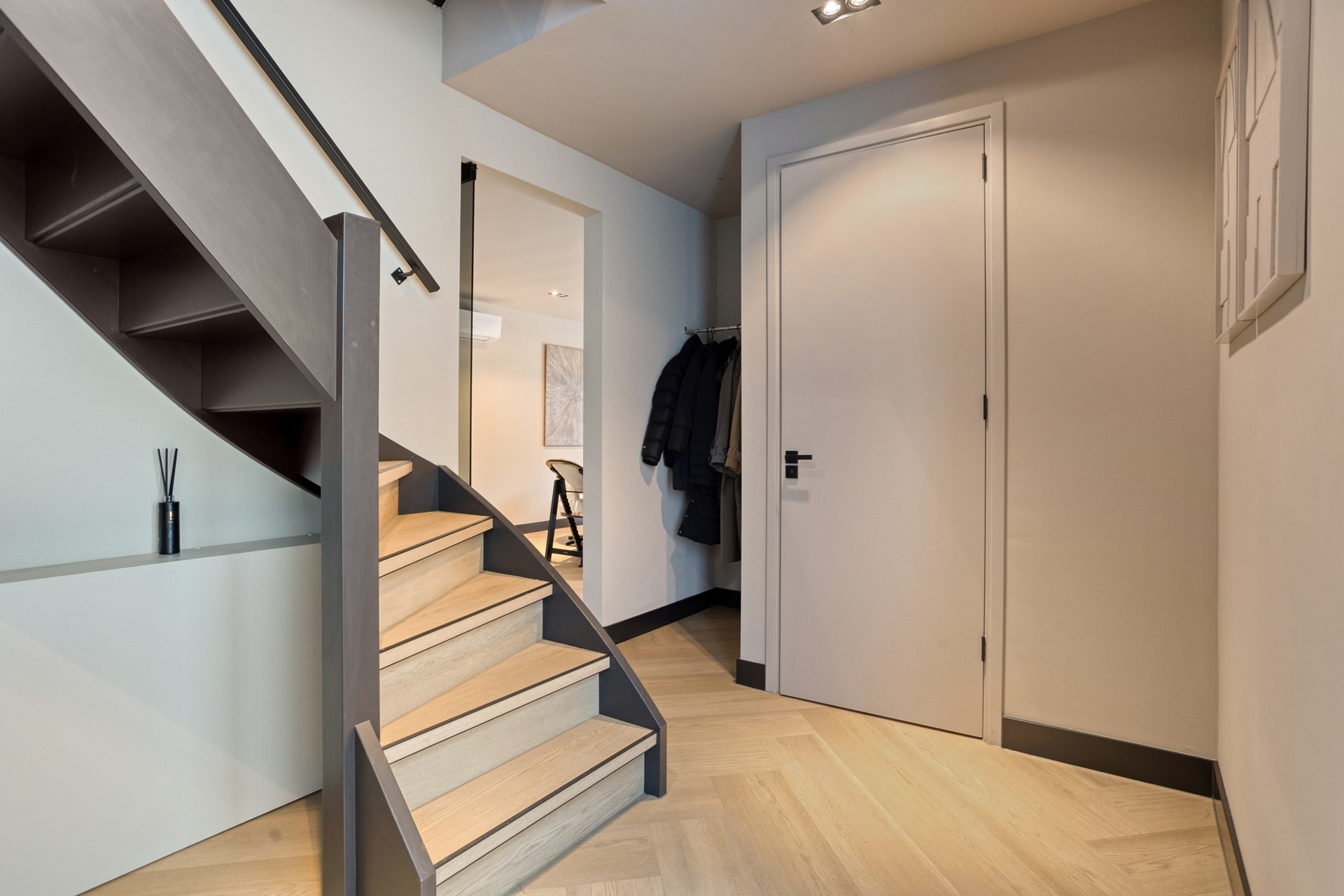 De entree verraadt direct de kwaliteit van de afwerking: een walvisgraatvloer met zwarte plinten, een trap met moderne details, en verfijnde wandpanelen zorgen voor een warm welkom. Het toilet bevindt zich in de entreehal; ook deze is voorzien van eenzelfde moderne afwerking. Middels een stijlvolle taatsdeur krijgt u toegang tot het leefgedeelte.