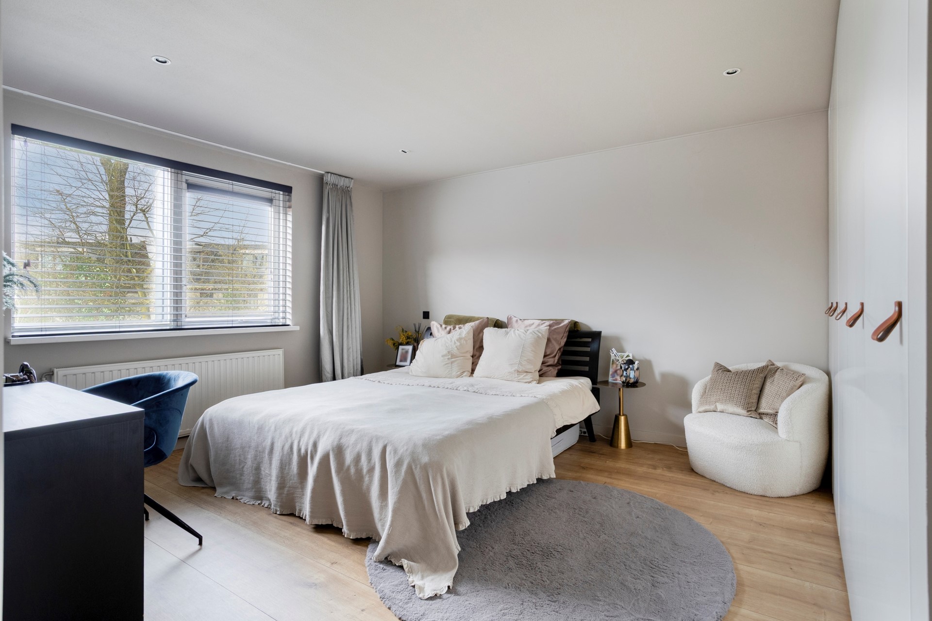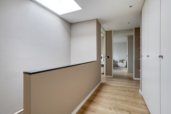 Via de trap in de hal bereikt u de 1e verdieping. Op deze verdieping bevinden zich vier slaapkamers en de badkamer. De overloop is voorzien van ingebouwde kasten, wat zorgt voor extra praktische opbergruimte en een nette uitstraling.