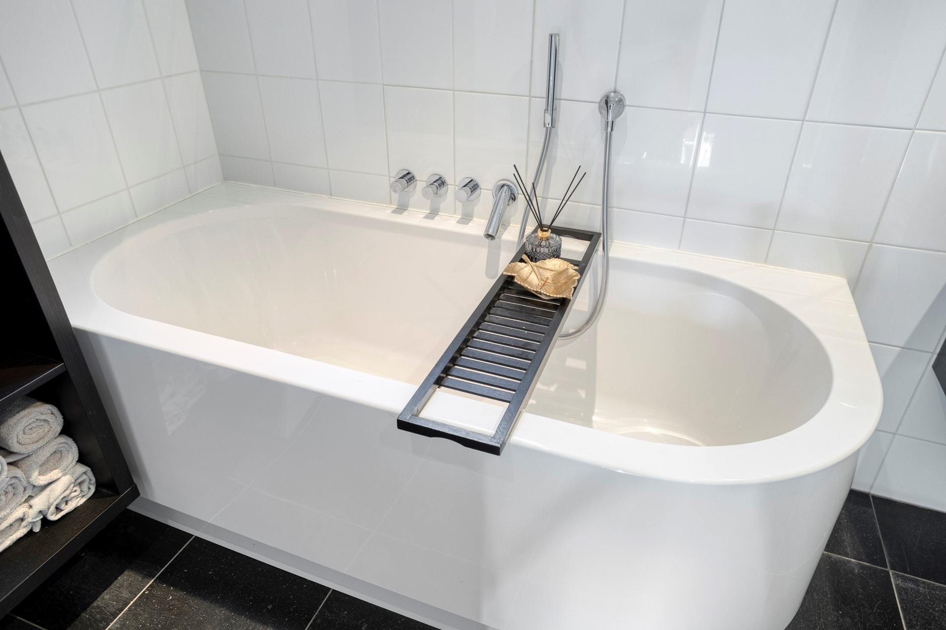 De betegelde badkamer is compleet en verzorgd uitgevoerd. U beschikt hier over een ligbad, een douchecabine met glazen deur, een wastafel en een staand toilet. Daarnaast is er een handdoekradiator aanwezig. De badkamer is goed onderhouden en biedt u alles wat u nodig heeft.