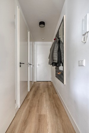 De aangrenzende gang is eveneens ruim van opzet, voorzien van een diepe berg-/inloopkast en biedt ruimte voor meerdere doeleinden.