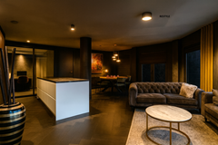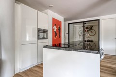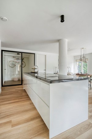 De woonkamer is een echte blikvanger, met ramen rondom die zorgen voor een overvloed aan natuurlijk licht. Het woongedeelte biedt volop ruimte voor een comfortabele zithoek en een royale eettafel. De open keuken is uitgevoerd in een luxe design en voorzien van onder meer een inductiekookplaat met geïntegreerde afzuiging, combi-oven, koel-/vriescombinatie en een vaatwasser. Kokkerellen voor uw gasten wordt hier eenvoudig gemaakt.