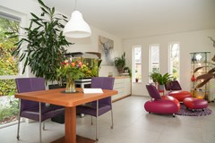 De woonkeuken is zonder twijfel het middelpunt van de woning. Deze vormt het hart van de woning en is in 2023 volledig vernieuwd. De hoogwaardige designkeuken uit Duitsland is uitgevoerd in glas en voorzien van luxe inbouwapparatuur, waaronder een Bora inductiekookplaat met geïntegreerde afzuiging, een combi-oven, separate oven, grote koelkast en vriezer. Een lichtarchitect heeft de keuken ontworpen, waardoor verschillende sferen mogelijk zijn – van helder werklicht tot sfeervol dimlicht in de avond.