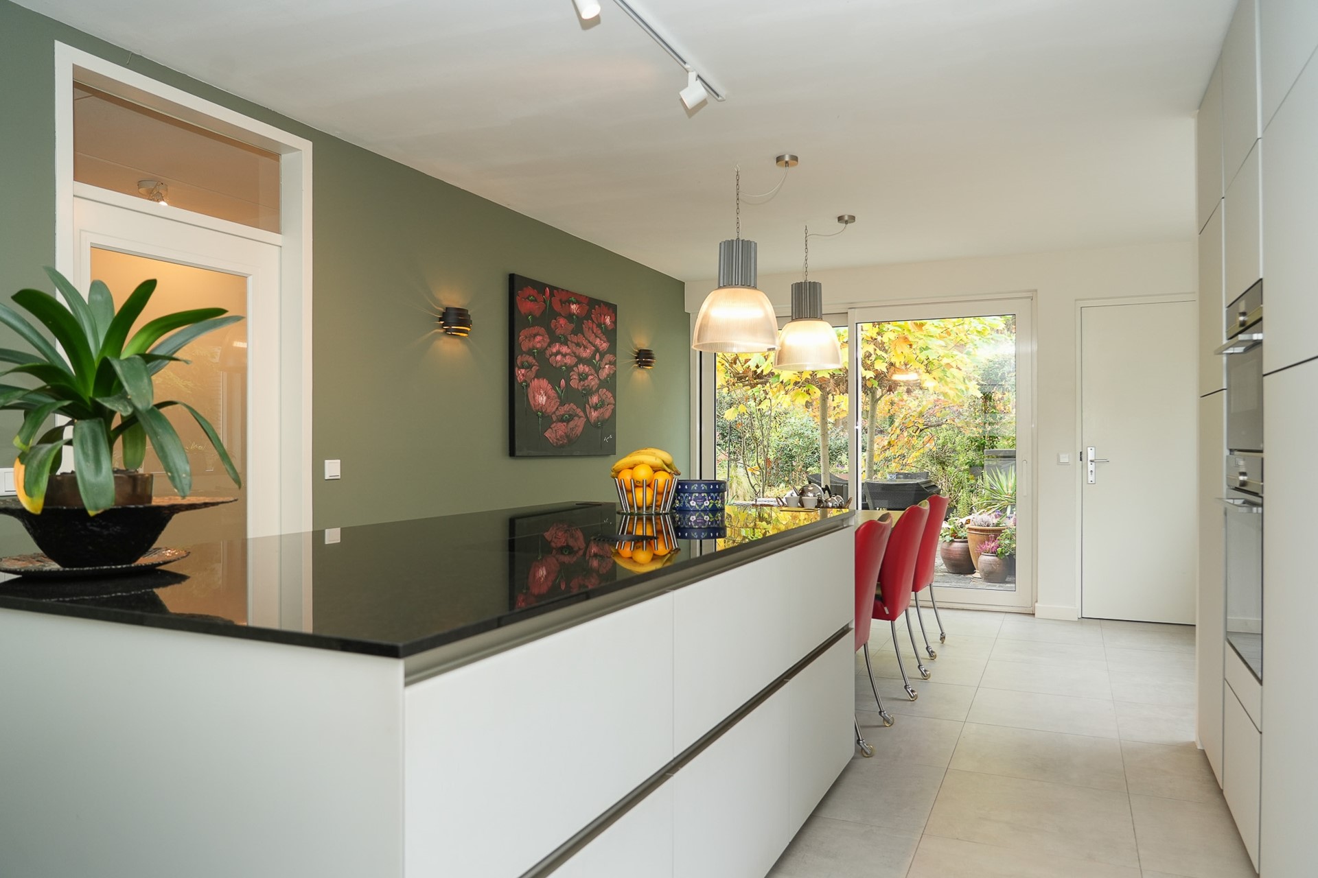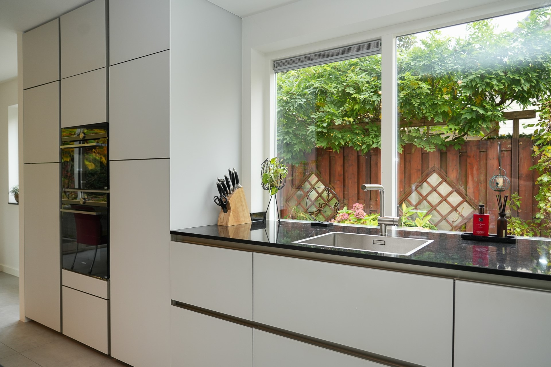 Via de lichte aluminium schuifpui (die zeer soepel en licht te bedienen is) staat de keuken in directe verbinding met de tuin, ideaal voor binnen-buiten leven.