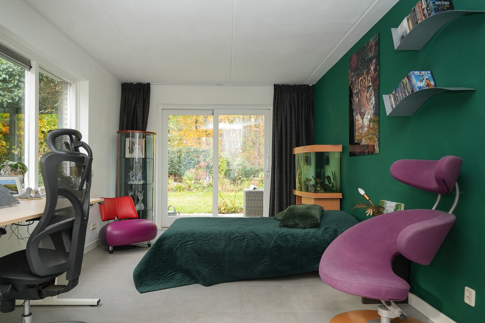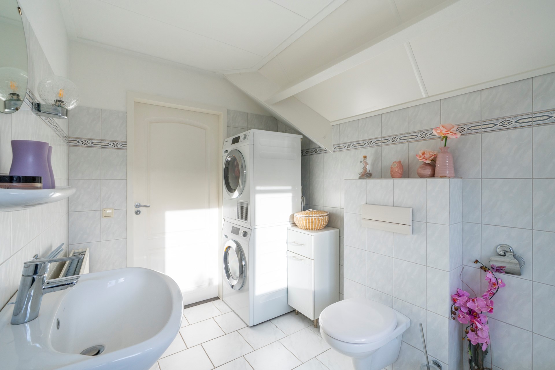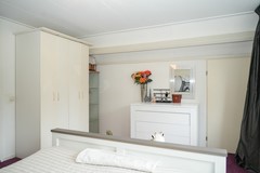 Aan de tuinzijde bevindt zich een ruime slaapkamer met rolluiken voor volledige verduistering. De aangrenzende badkamer beschikt over een douchecabine, bidet en dubbele wastafel. Deze indeling maakt comfortabel gelijkvloers wonen mogelijk.