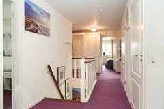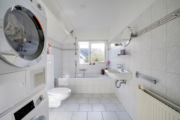 Op de eerste verdieping bevinden zich drie slaapkamers, waarvan twee zeer ruim. De tweede badkamer is voorzien van een ligbad, toilet en wastafel. Tevens zijn hier de aansluitingen voor wasmachine en droger aanwezig, met de mogelijkheid om een aparte wasruimte te creëren.