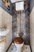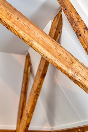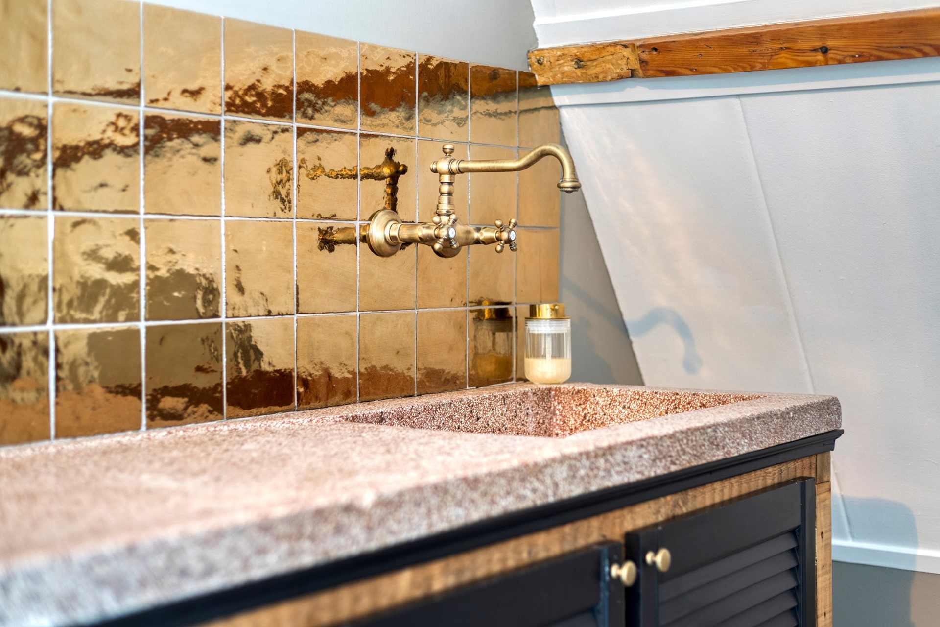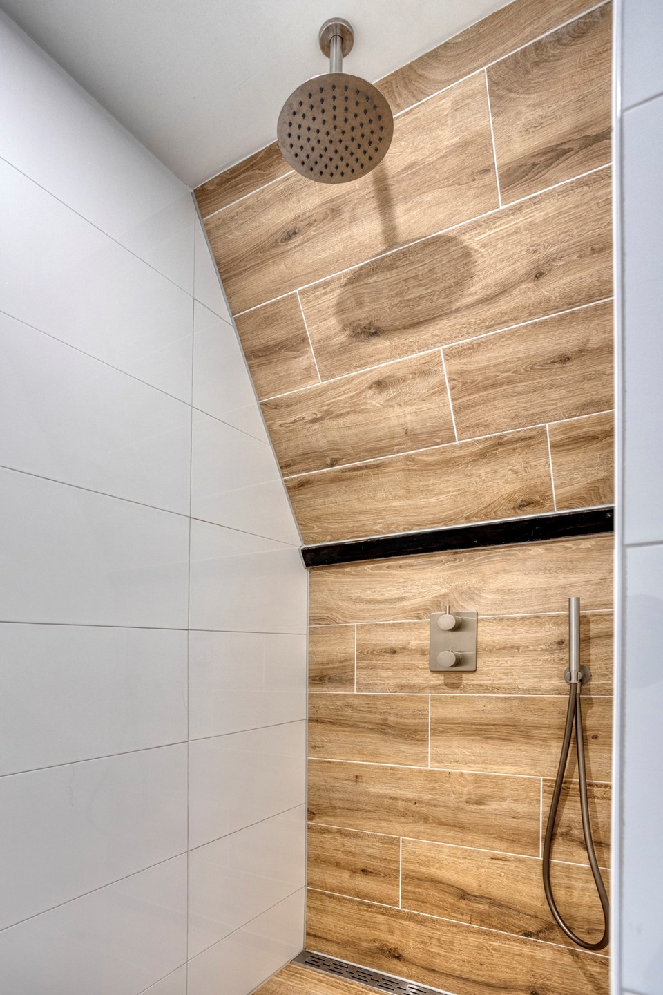 The second floor surprises with a generous, open space and a distinctive layout. The warm ambiance stands out immediately thanks to the fine flooring and the exposed wooden trusses that give this level its unique character and inviting feel. The floor is arranged so that the sleeping area, lounge corner, and work/study area flow into one another. This level also features its own pantry with original terrazzo countertop and a private bathroom, elegantly finished with wood-look floor tiles, white wall tiles, and black beam accents. The bathroom includes a walk-in rain shower, wall-hung toilet, and another vessel basin set on a robust oak top with integrated tap. A wonderfully luxurious addition, making this floor perfect as a home office, self-contained (guest) suite, a loft for one of your children, or your expansive master retreat!