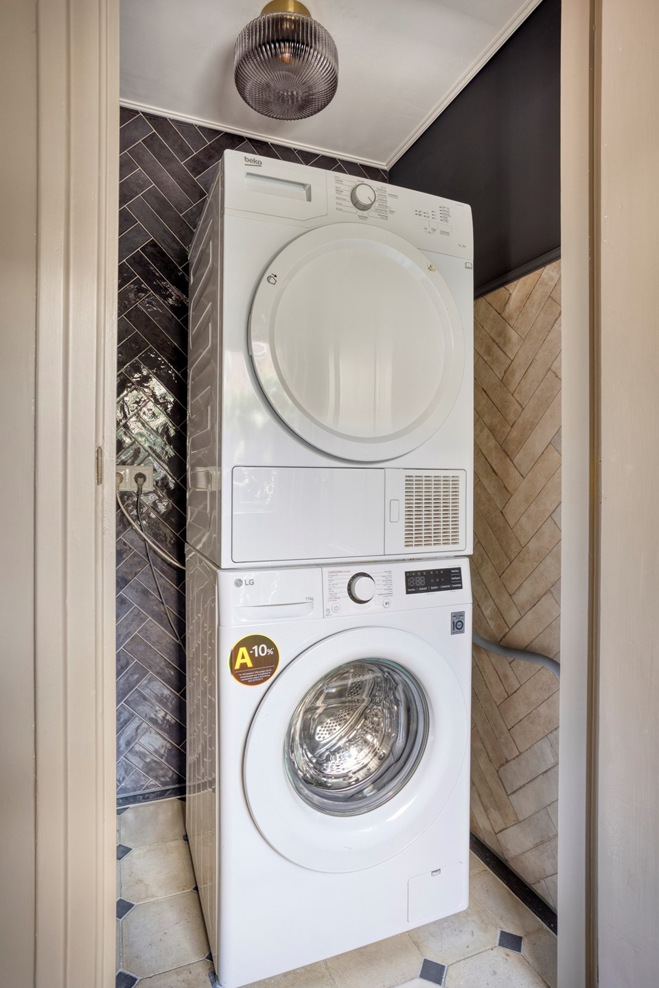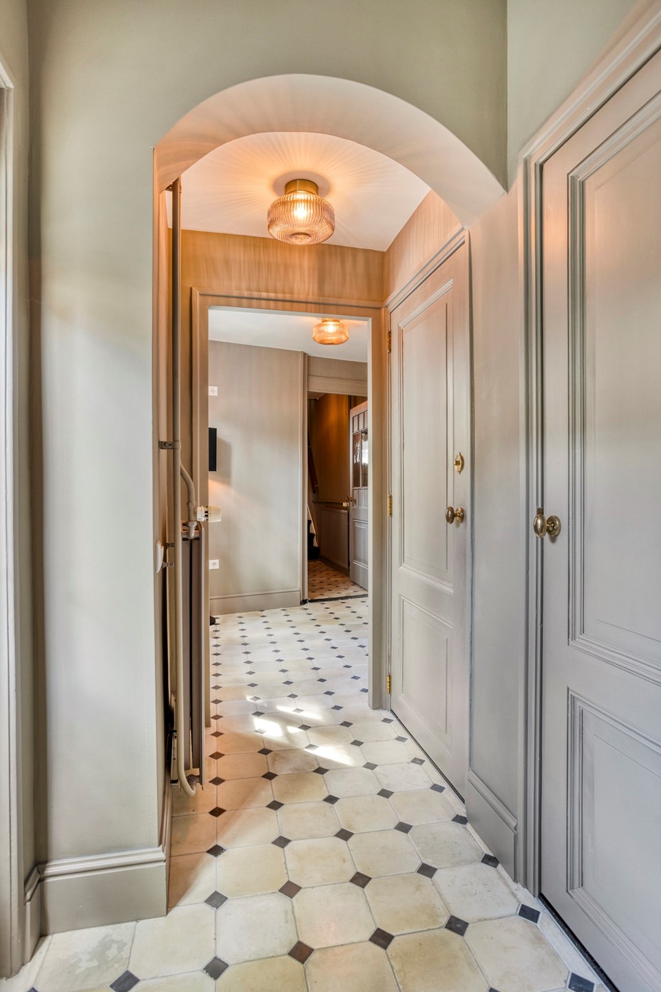The generous hallway sets the tone right away: high ceiling, a combination of classic tiles and sleek walls, elegant staircase, panelled doors, and an authentic feel. From here you access various rooms, including the living room, dining room, WC with washbasin, and the kitchen.