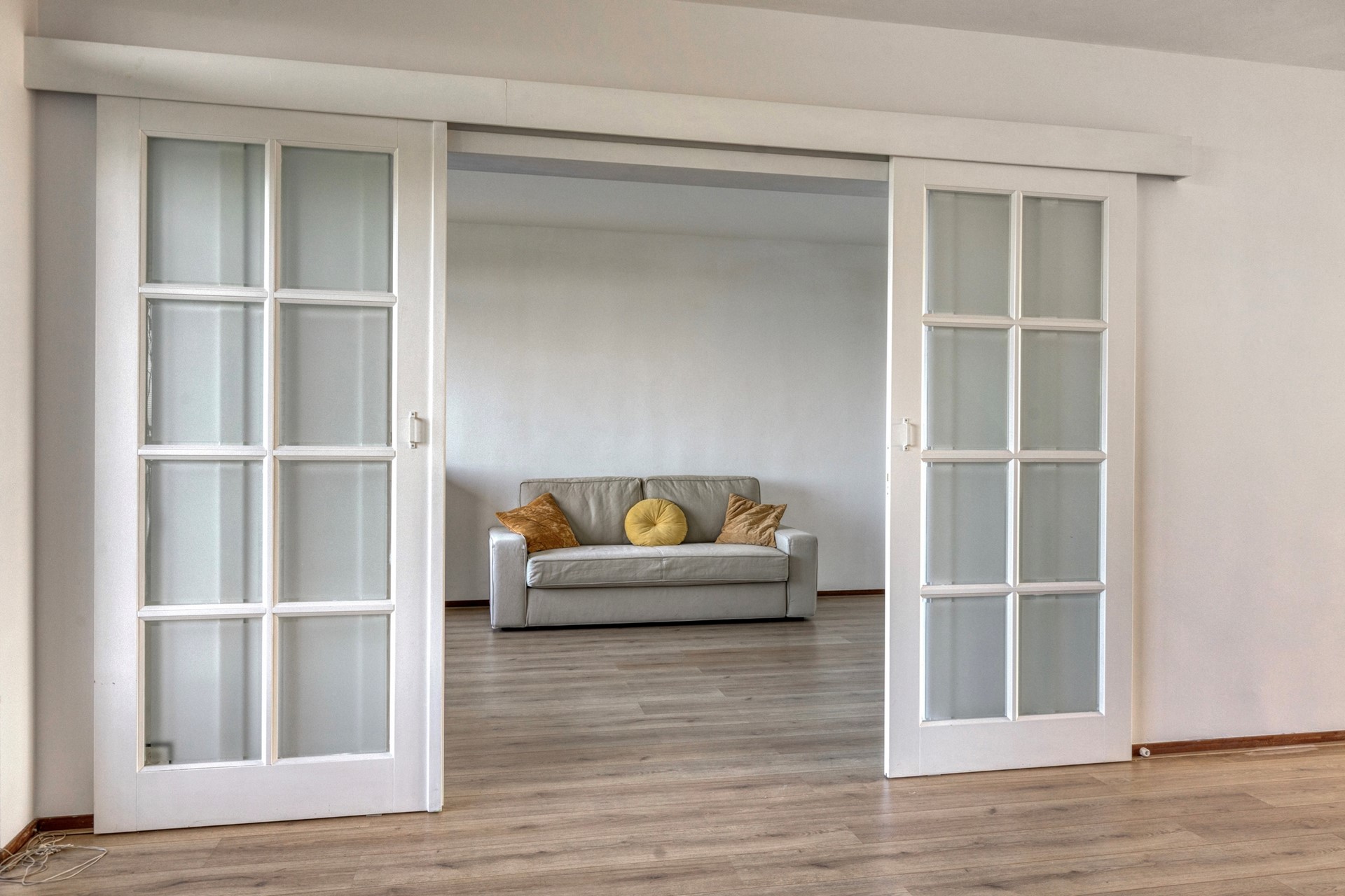 • Aangrenzend aan de woonkamer bevindt zich een extra kamer, momenteel in gebruik als studeerkamer, gescheiden met stijlvolle schuifdeuren.
