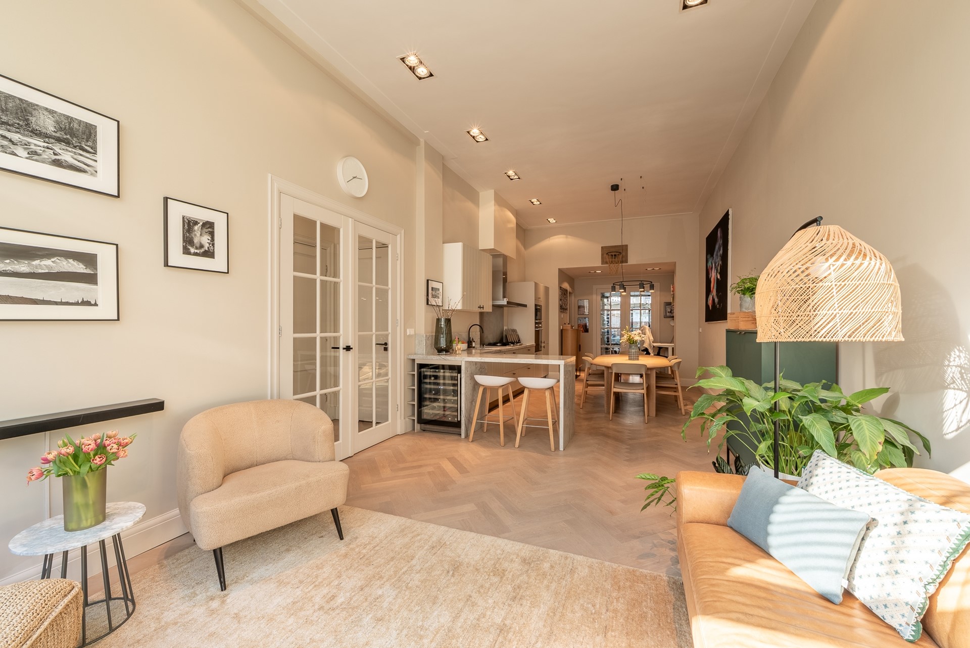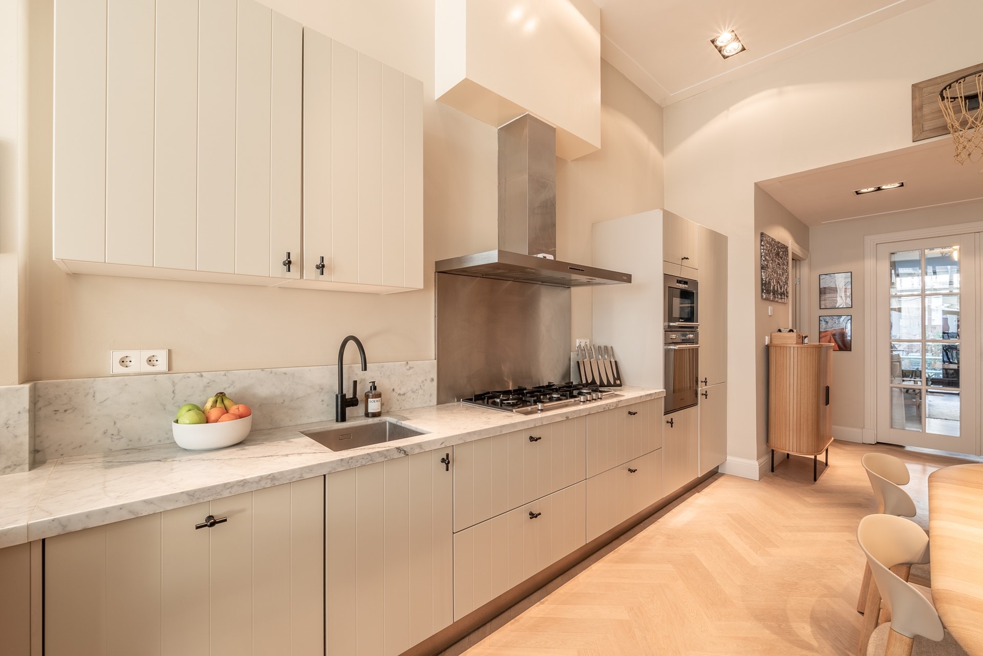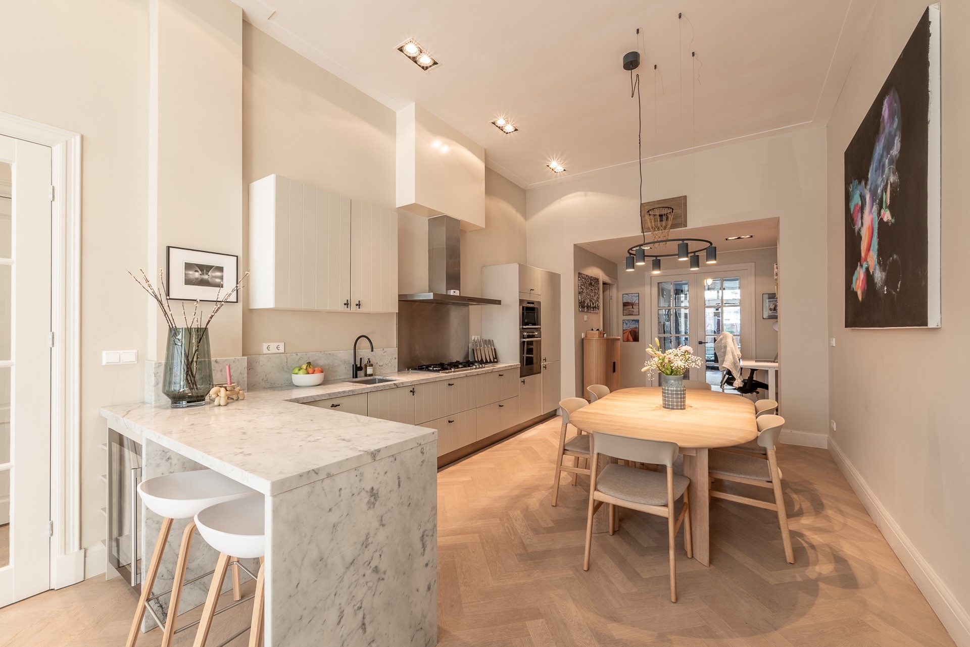 Aan de voorzijde ligt de ruime en sfeervolle woonkamer met grote ramen en een prachtige visgraatvloer. Dankzij de hoge plafonds en royale afmetingen voelt deze ruimte bijzonder licht en ruim aan. De woonkamer loopt over in de royale en open eetkeuken. De keuken is modern en luxe uitgevoerd en voorzien van diverse inbouwapparatuur. Het marmeren werkblad geeft de keuken een elegante uitstraling.