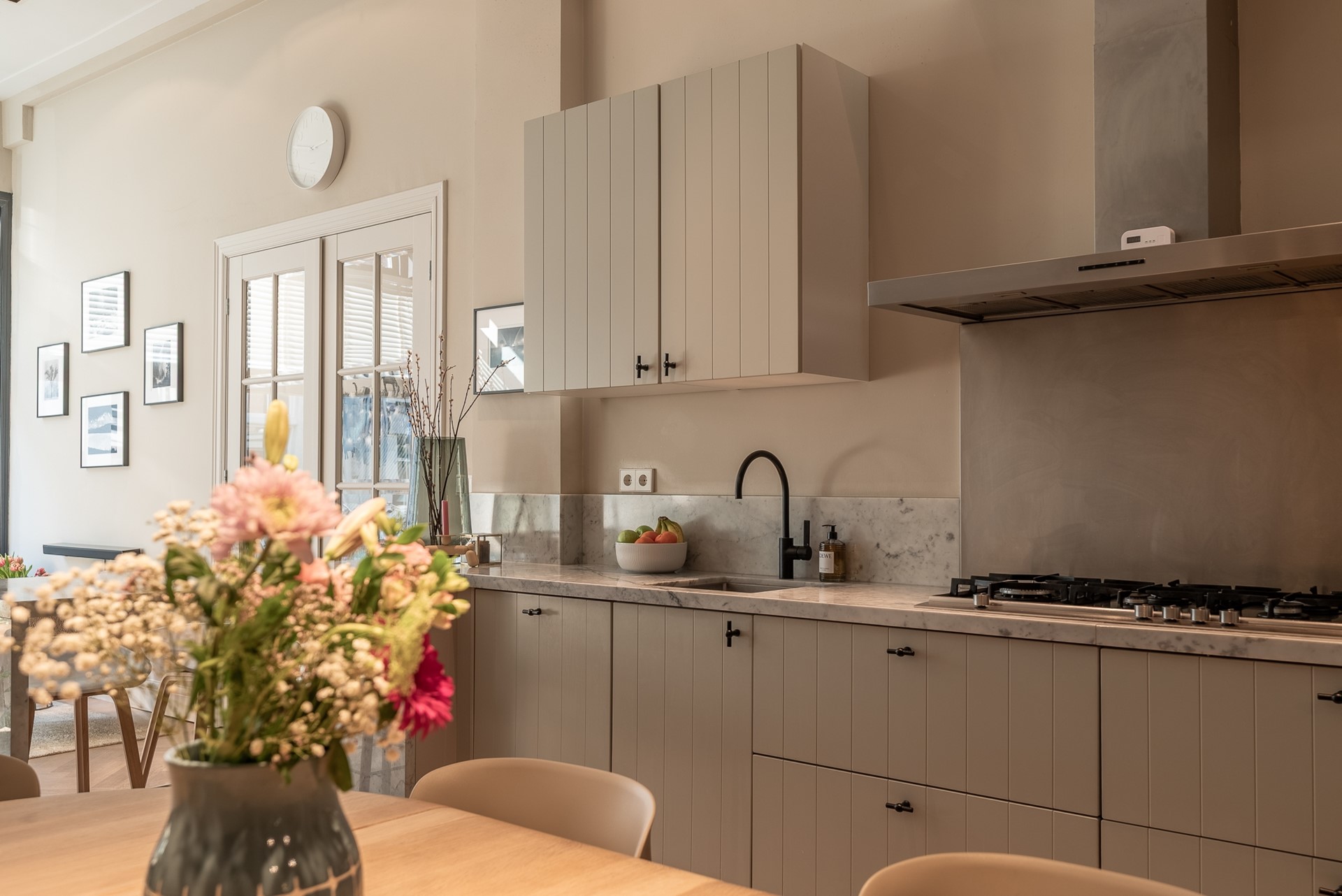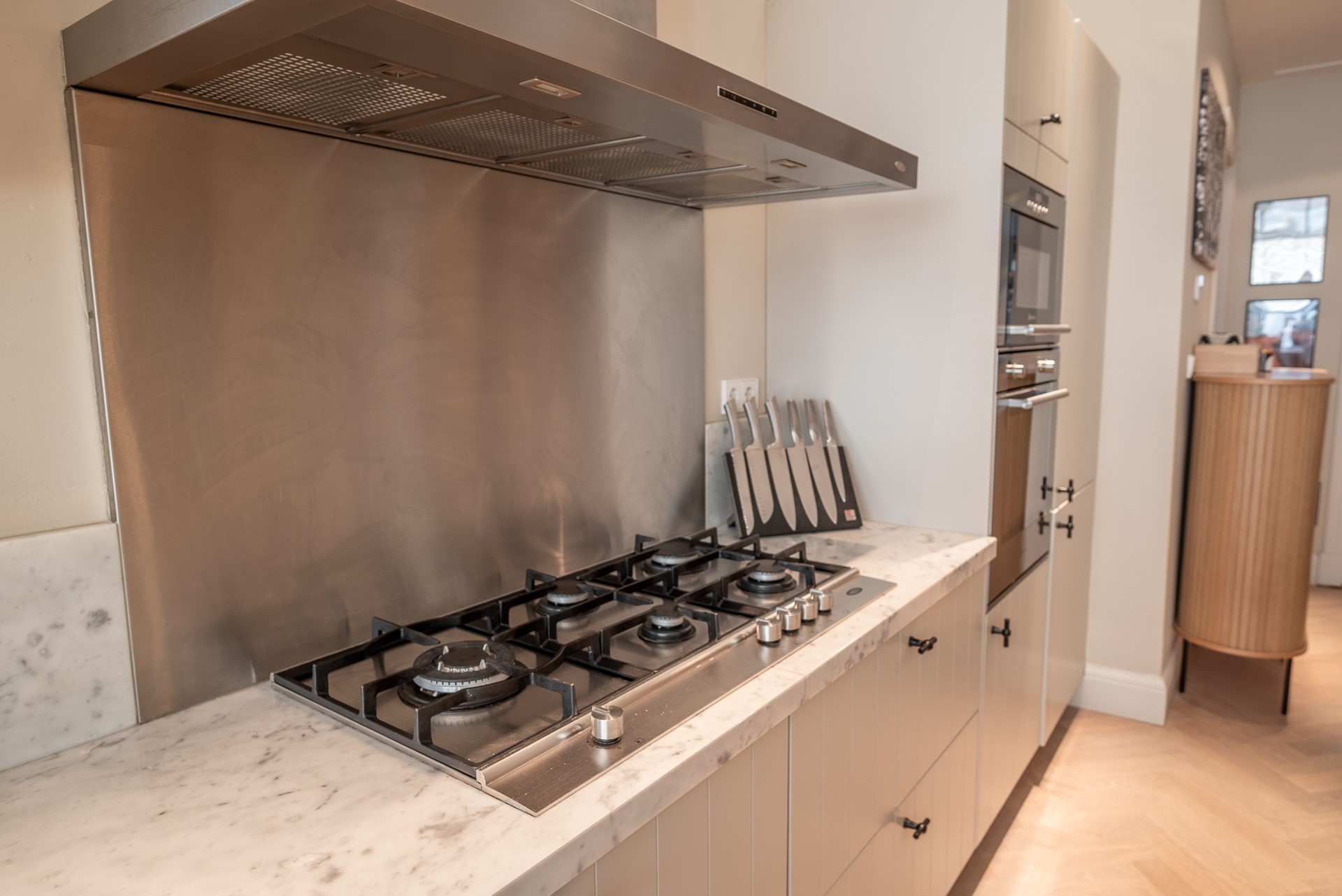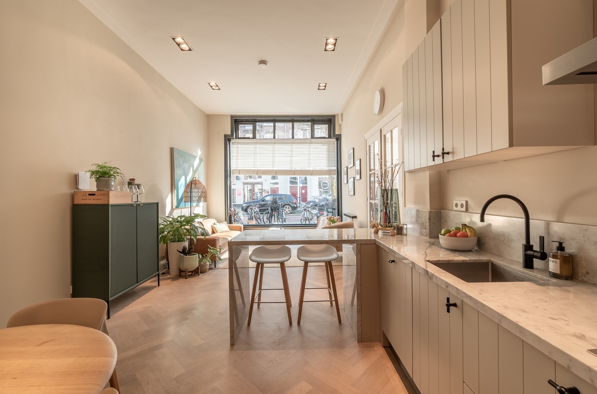 Aan de voorzijde ligt de ruime en sfeervolle woonkamer met grote ramen en een prachtige visgraatvloer. Dankzij de hoge plafonds en royale afmetingen voelt deze ruimte bijzonder licht en ruim aan. De woonkamer loopt over in de royale en open eetkeuken. De keuken is modern en luxe uitgevoerd en voorzien van diverse inbouwapparatuur. Het marmeren werkblad geeft de keuken een elegante uitstraling.