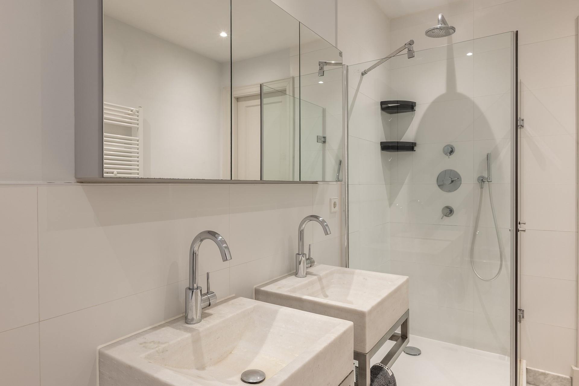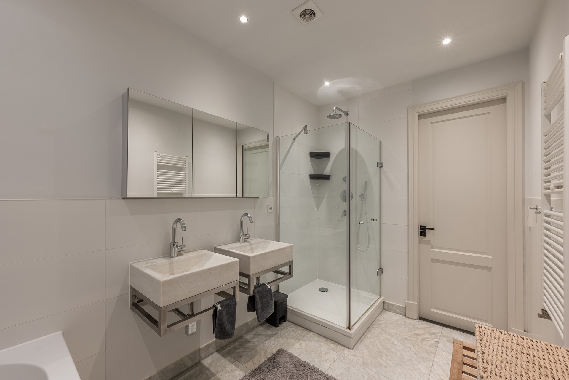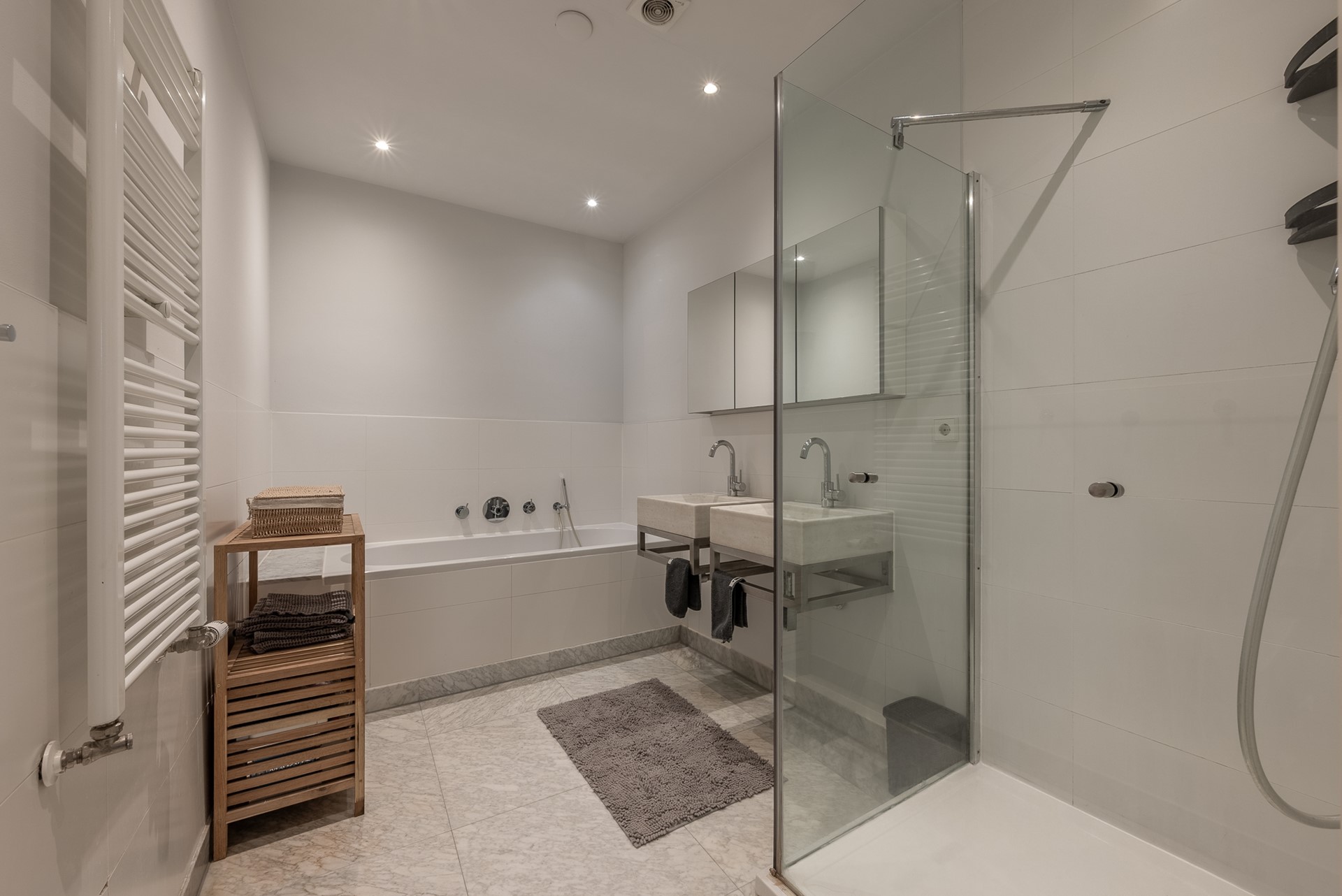 Vanuit de slaapkamer bereik je een tussenhal met de meterkast, een tweede toilet en een wasruimte. Vanuit deze hal is tevens toegang tot de ruime badkamer, voorzien van een ligbad, inloopdouche en dubbele wastafel.