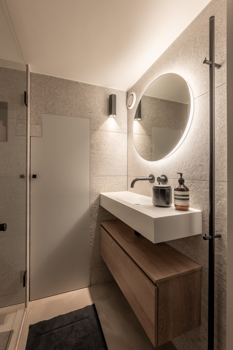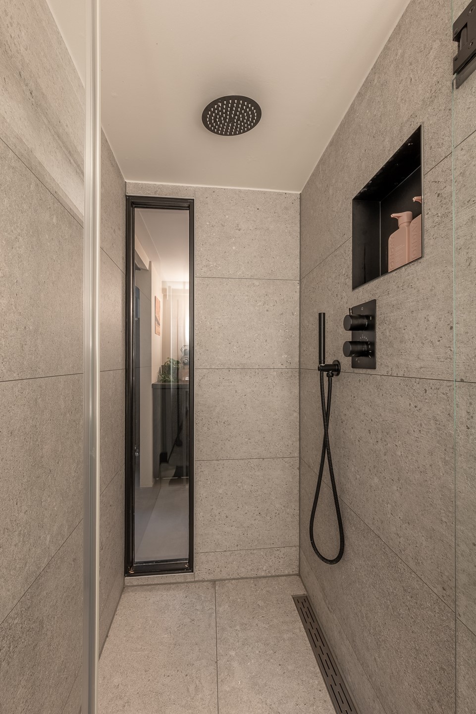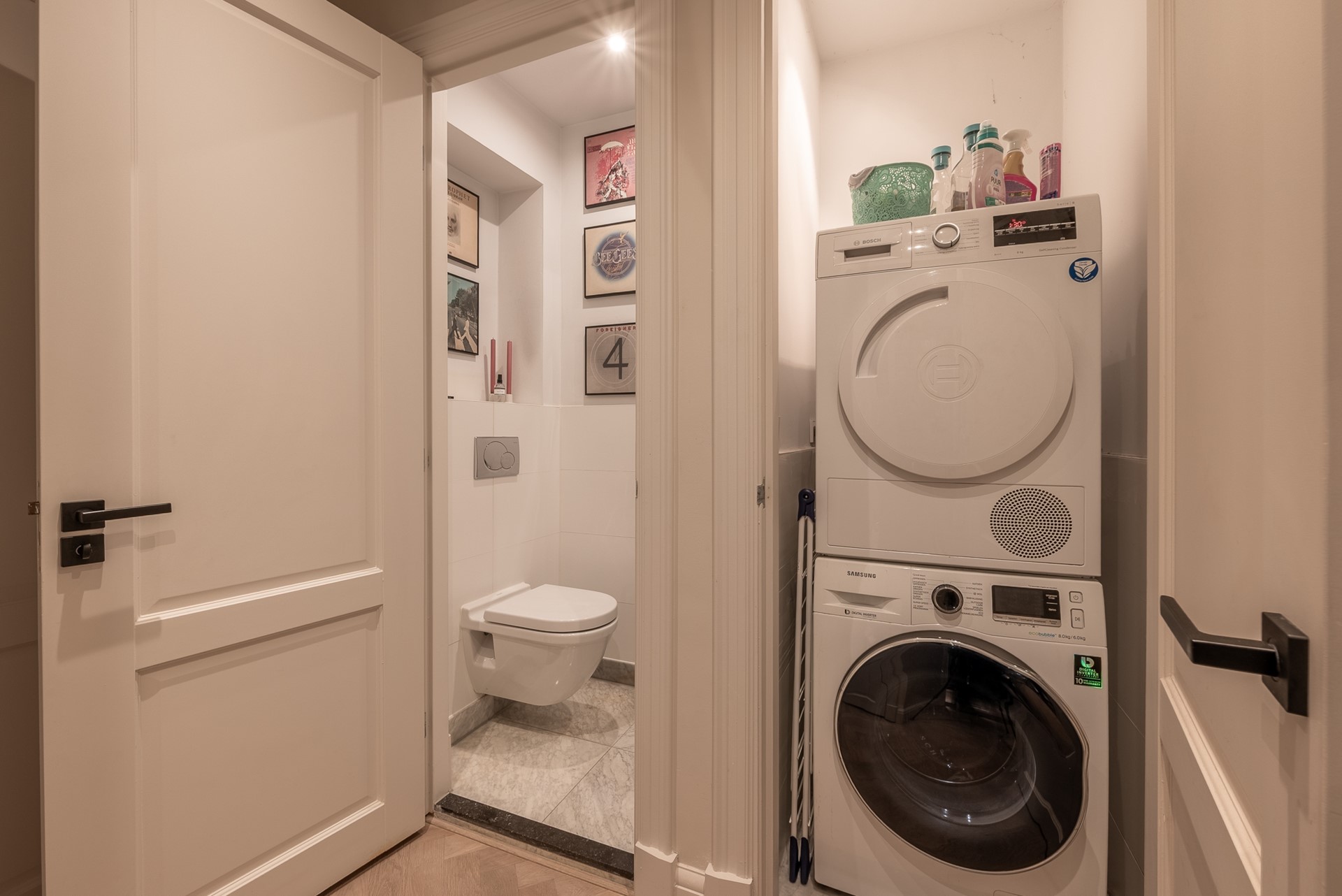 Vanuit de slaapkamer bereik je een tussenhal met de meterkast, een tweede toilet en een wasruimte. Vanuit deze hal is tevens toegang tot de ruime badkamer, voorzien van een ligbad, inloopdouche en dubbele wastafel.