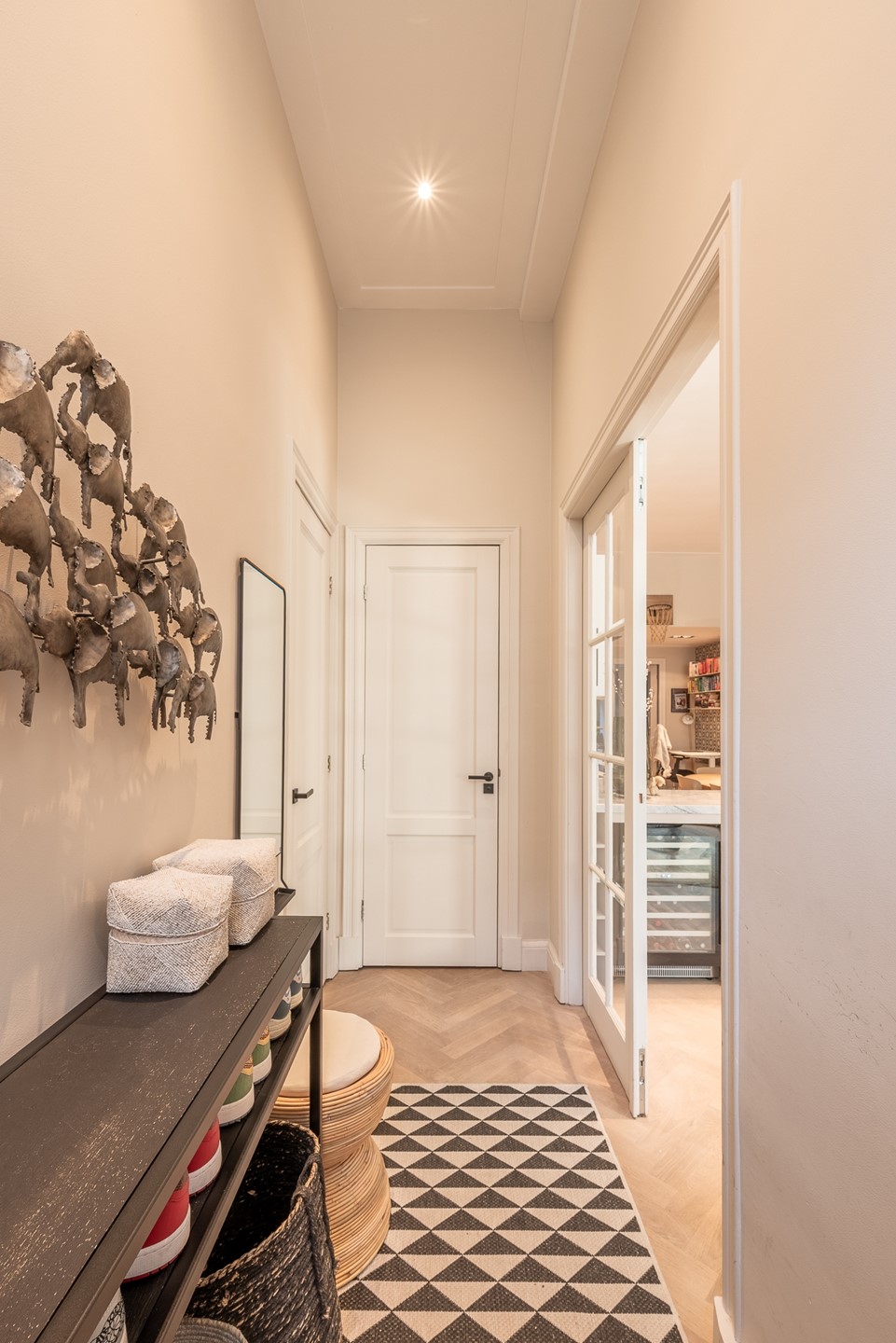 Via de eigen entree betreed je de woning en kom je in de hal met garderobe en een separaat toilet. Deur naar het souterrain.