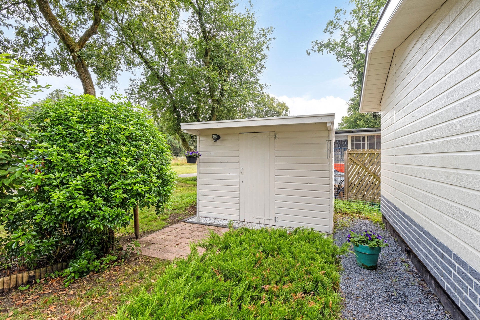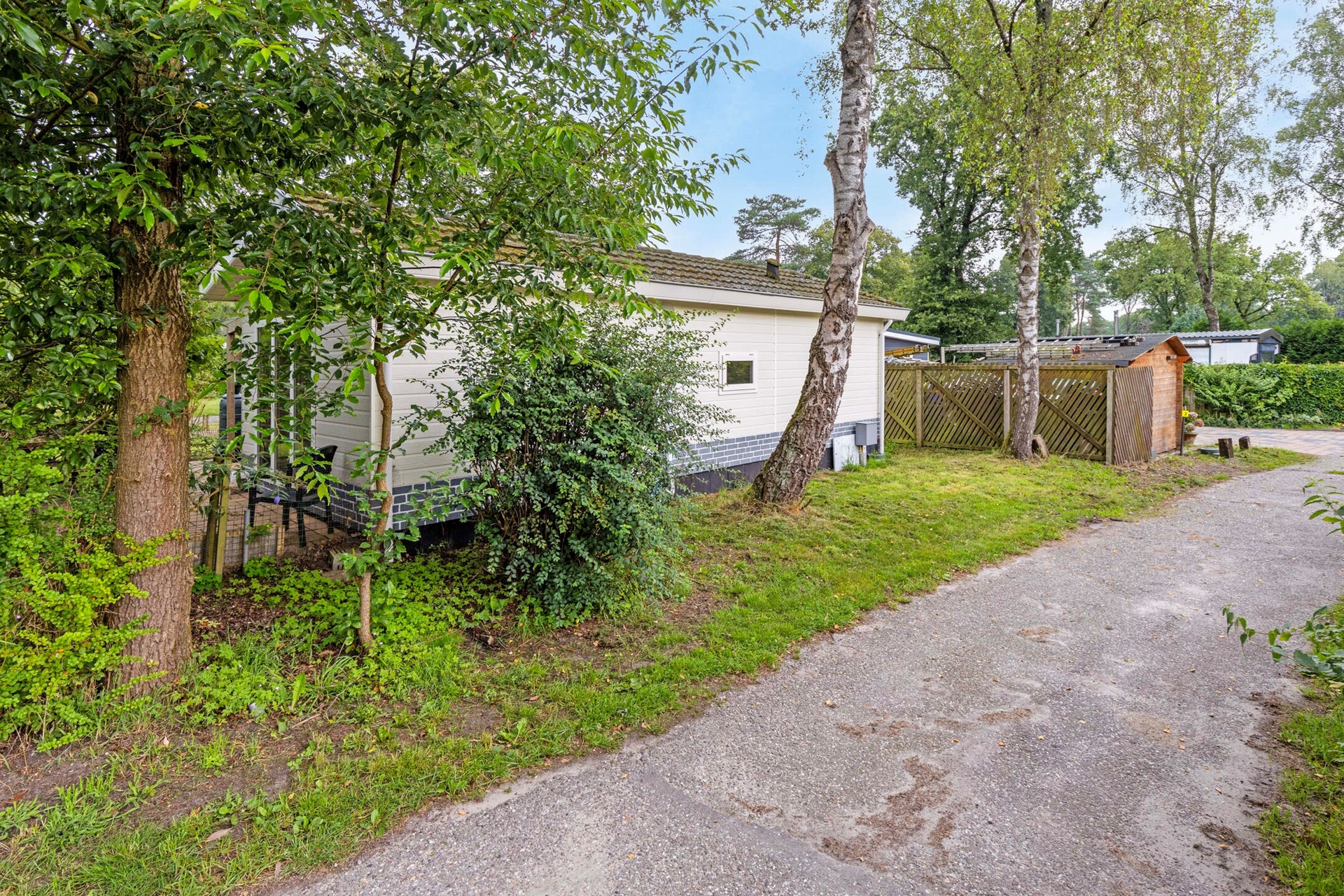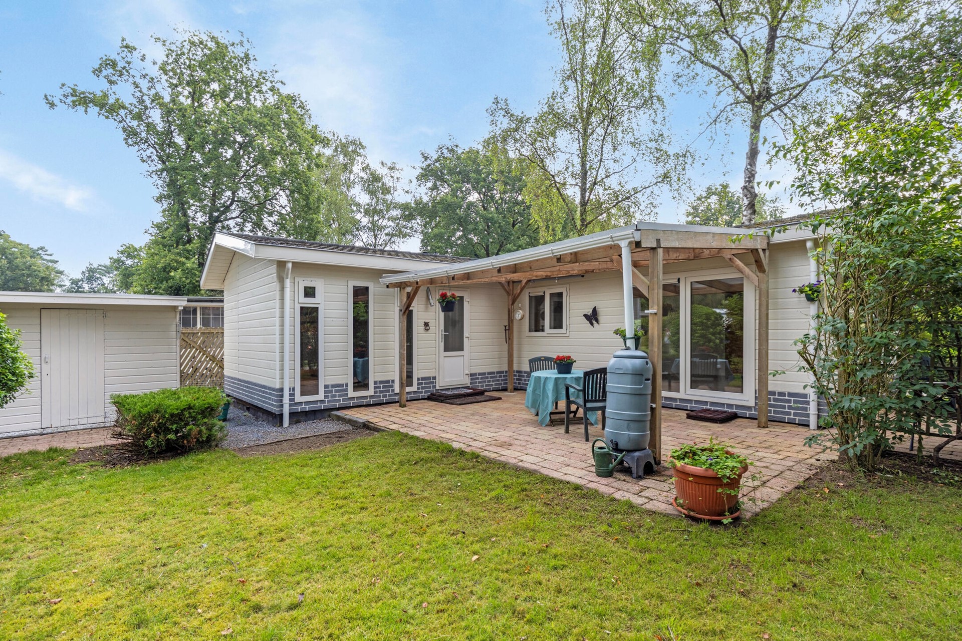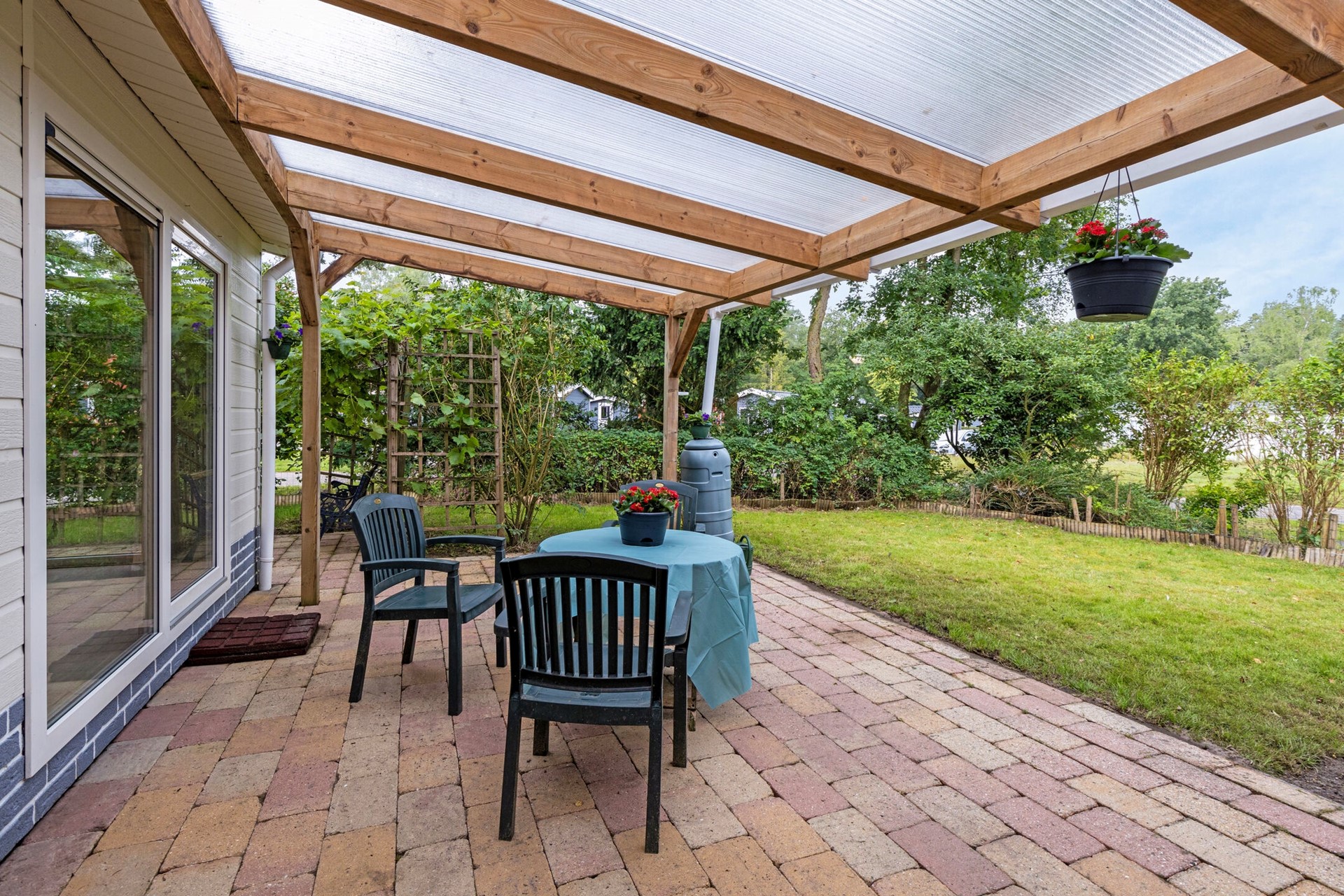 Rondom de chaletwoning is een groene tuin aanwezig. De tuin is goed onderhouden en voorzien van een terras. Hiermee is het geschikt voor een lounge set of buitentafel en vormt het de ideale plek om te ontspannen. Het terras is overkapt, waardoor u geniet u van veel privacy. De ligging is ideaal om volop van de zonuren te genieten. Een extra berging maakt het mogelijk om tuinspullen te stallen. U auto kunt u op eigen terrein parkeren. Het chalet is gelegen op een perceel met erfpacht tot 2043 ( verlenging in overleg).