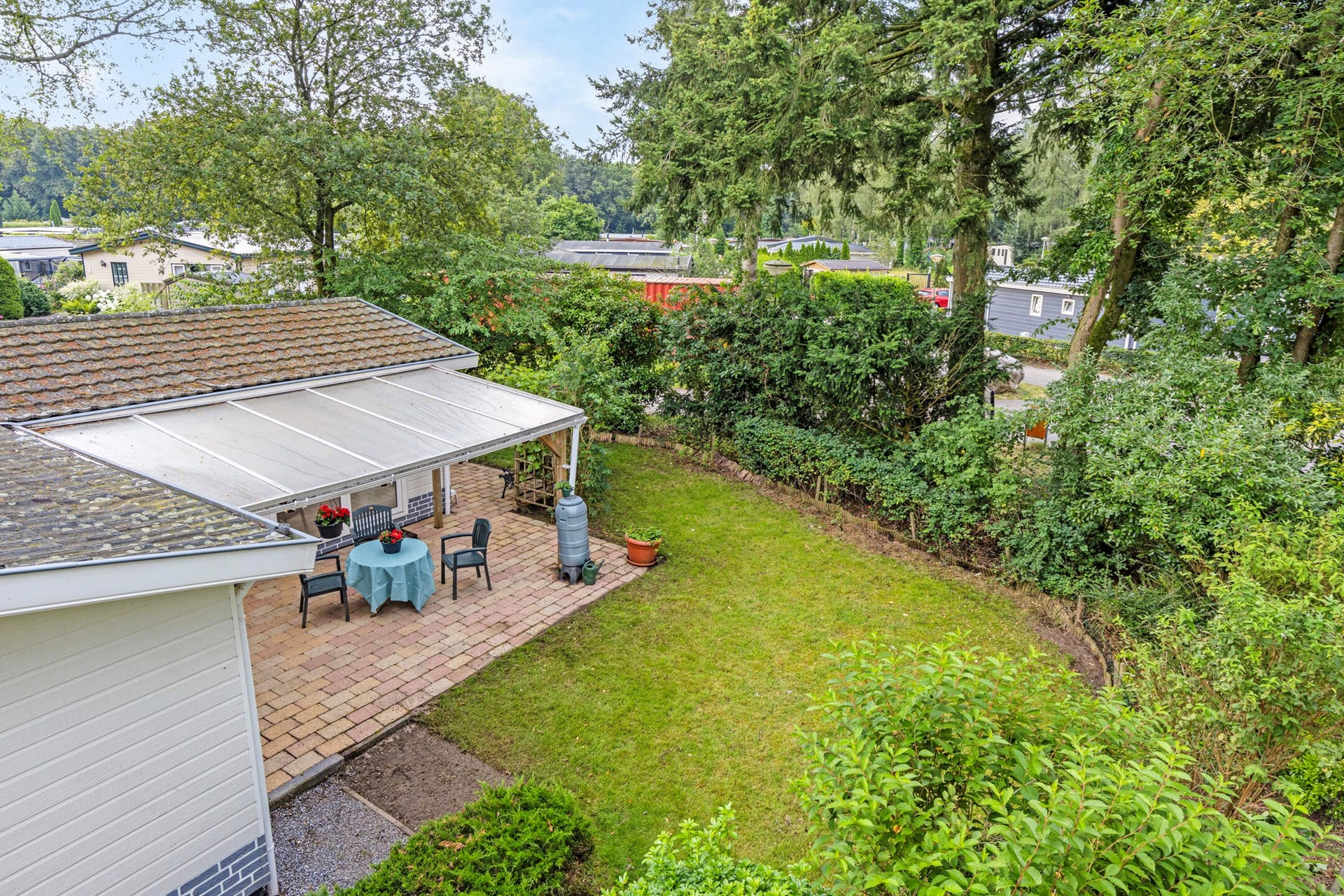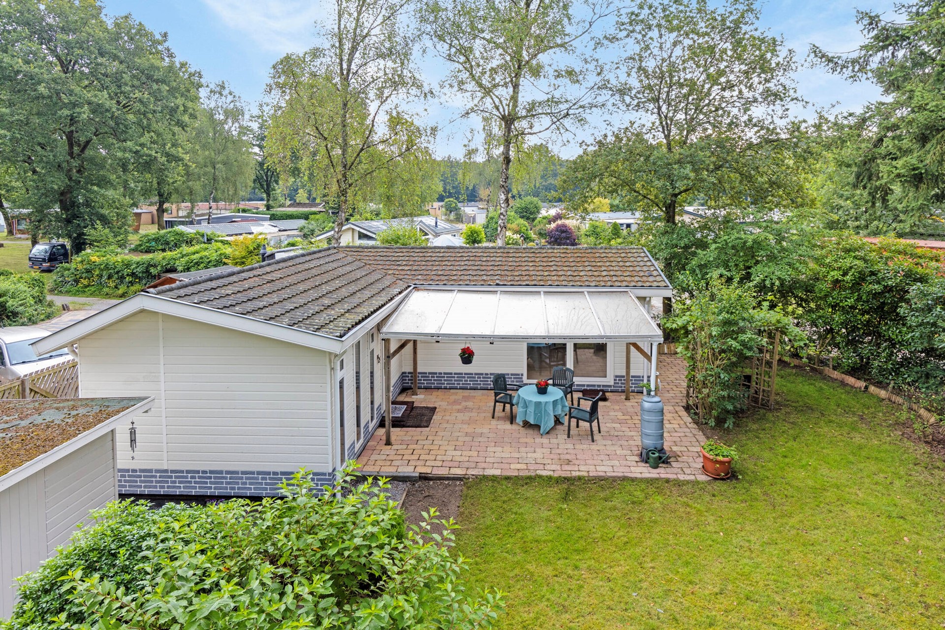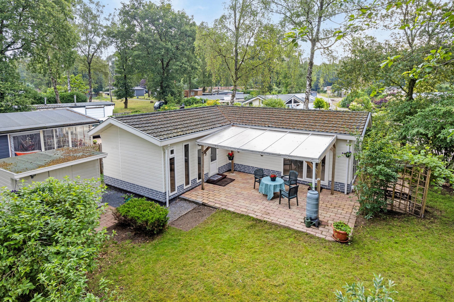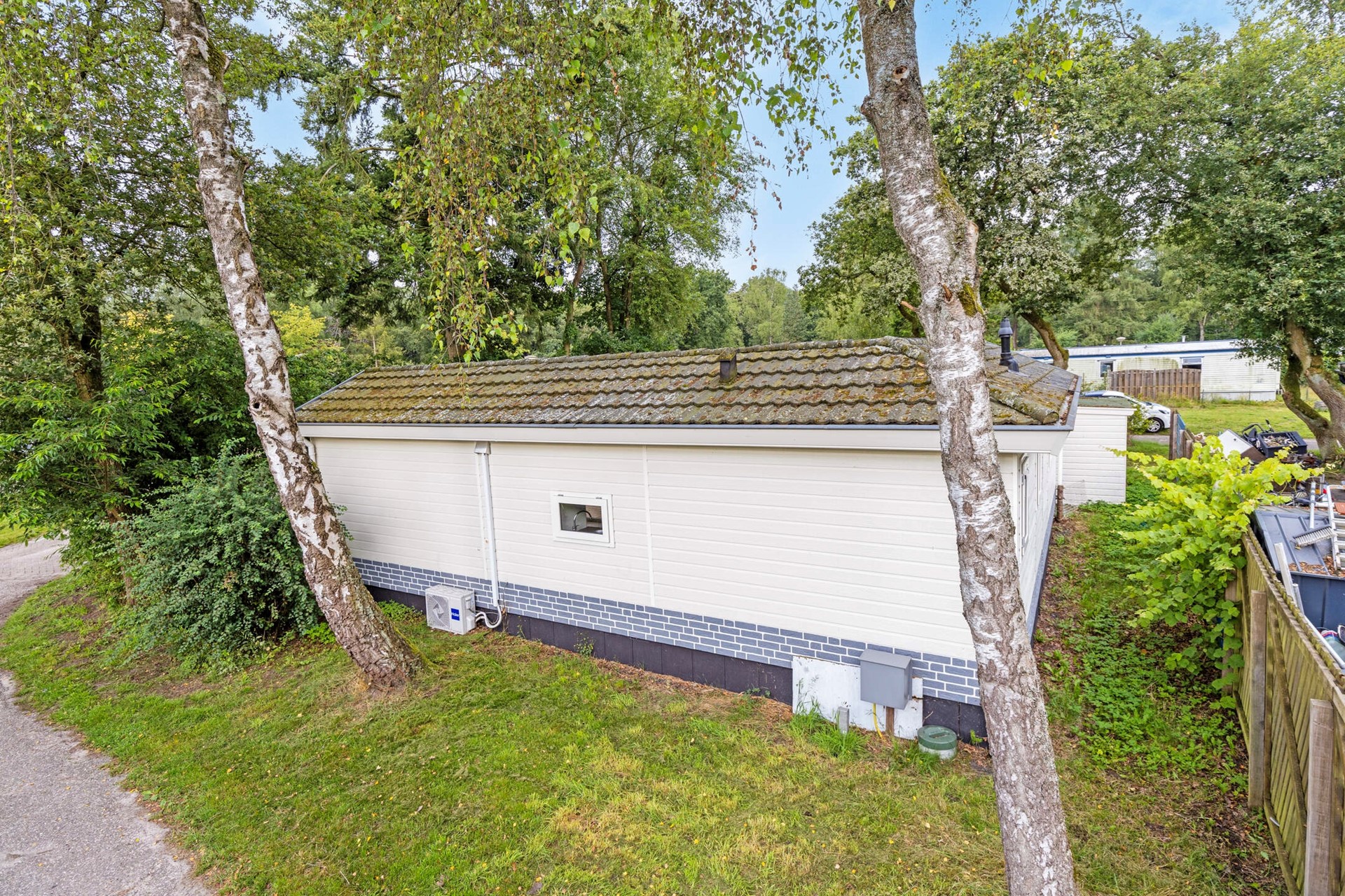Rondom de chaletwoning is een groene tuin aanwezig. De tuin is goed onderhouden en voorzien van een terras. Hiermee is het geschikt voor een lounge set of buitentafel en vormt het de ideale plek om te ontspannen. Het terras is overkapt, waardoor u geniet u van veel privacy. De ligging is ideaal om volop van de zonuren te genieten. Een extra berging maakt het mogelijk om tuinspullen te stallen. U auto kunt u op eigen terrein parkeren. Het chalet is gelegen op een perceel met erfpacht tot 2043 ( verlenging in overleg).