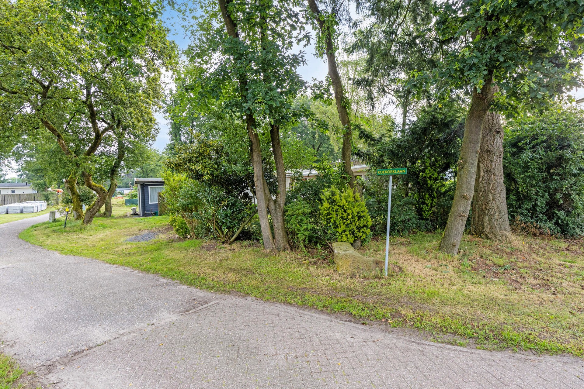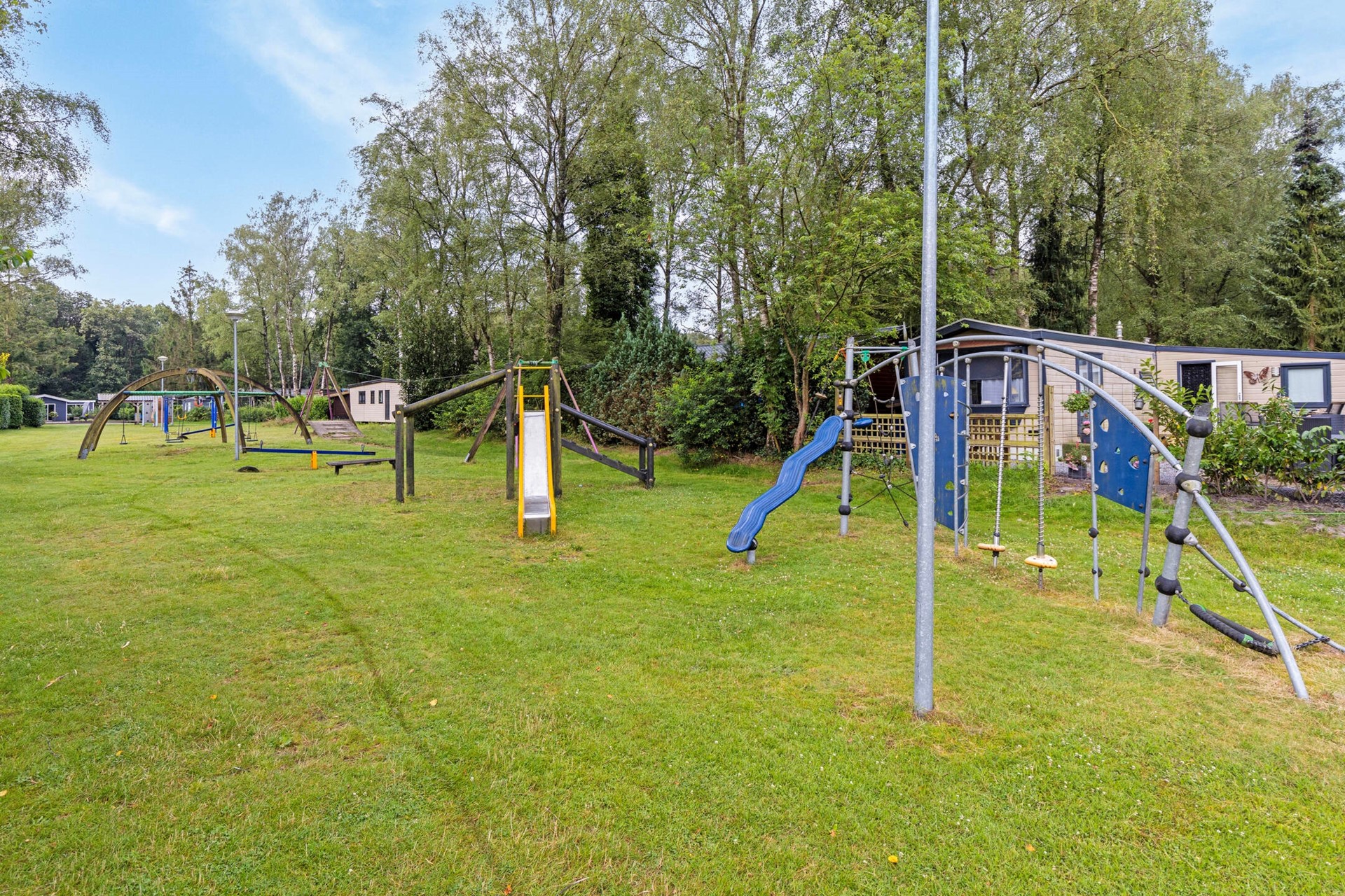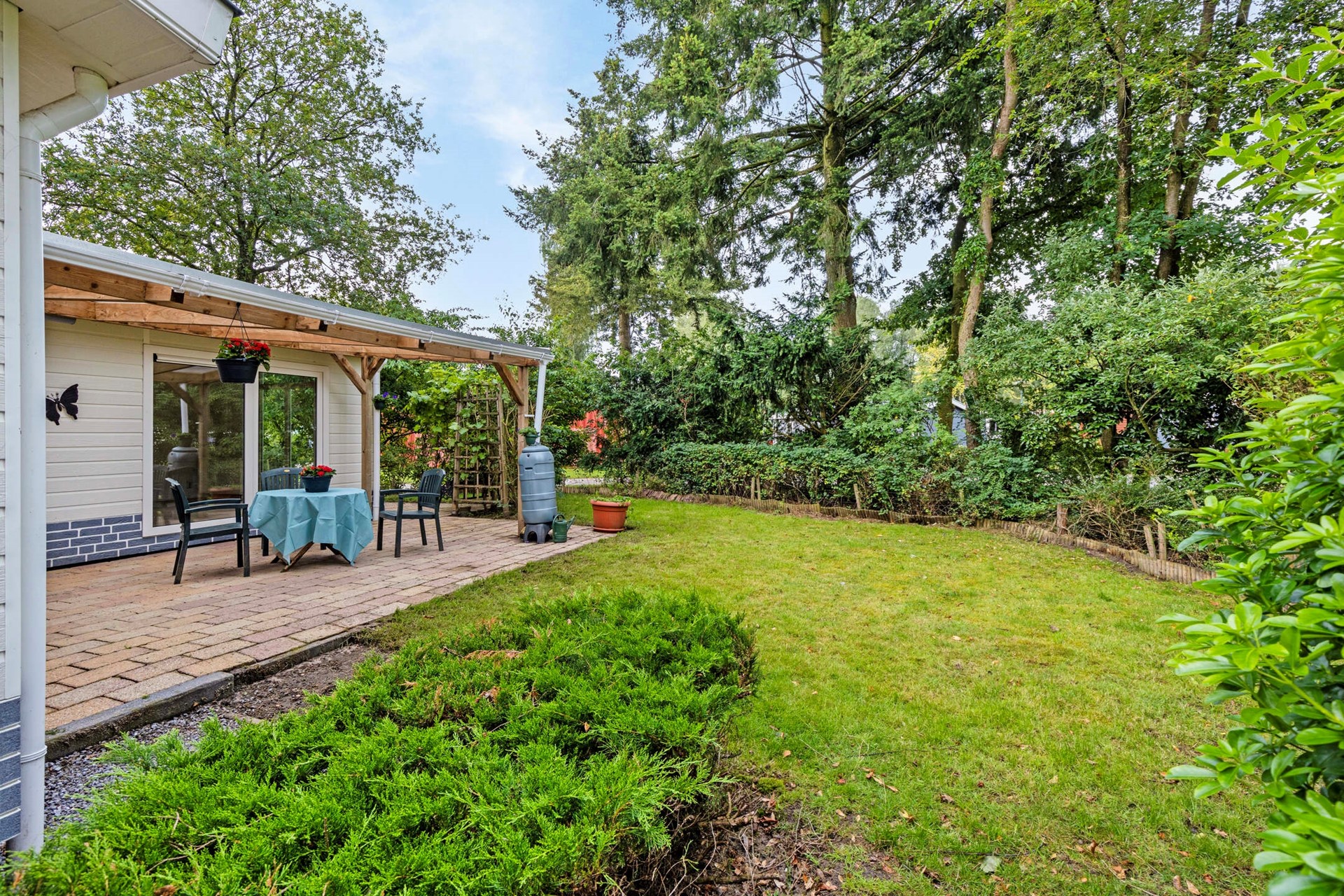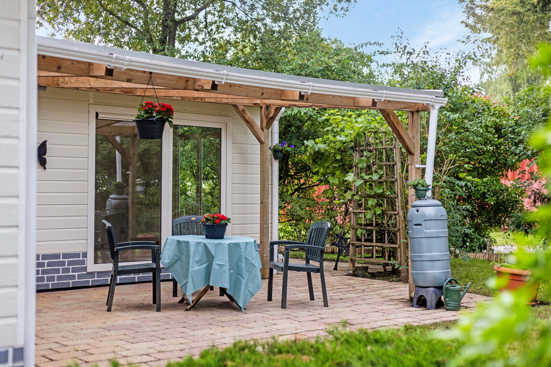 Rondom de chaletwoning is een groene tuin aanwezig. De tuin is goed onderhouden en voorzien van een terras. Hiermee is het geschikt voor een lounge set of buitentafel en vormt het de ideale plek om te ontspannen. Het terras is overkapt, waardoor u geniet u van veel privacy. De ligging is ideaal om volop van de zonuren te genieten. Een extra berging maakt het mogelijk om tuinspullen te stallen. U auto kunt u op eigen terrein parkeren. Het chalet is gelegen op een perceel met erfpacht tot 2043 ( verlenging in overleg).