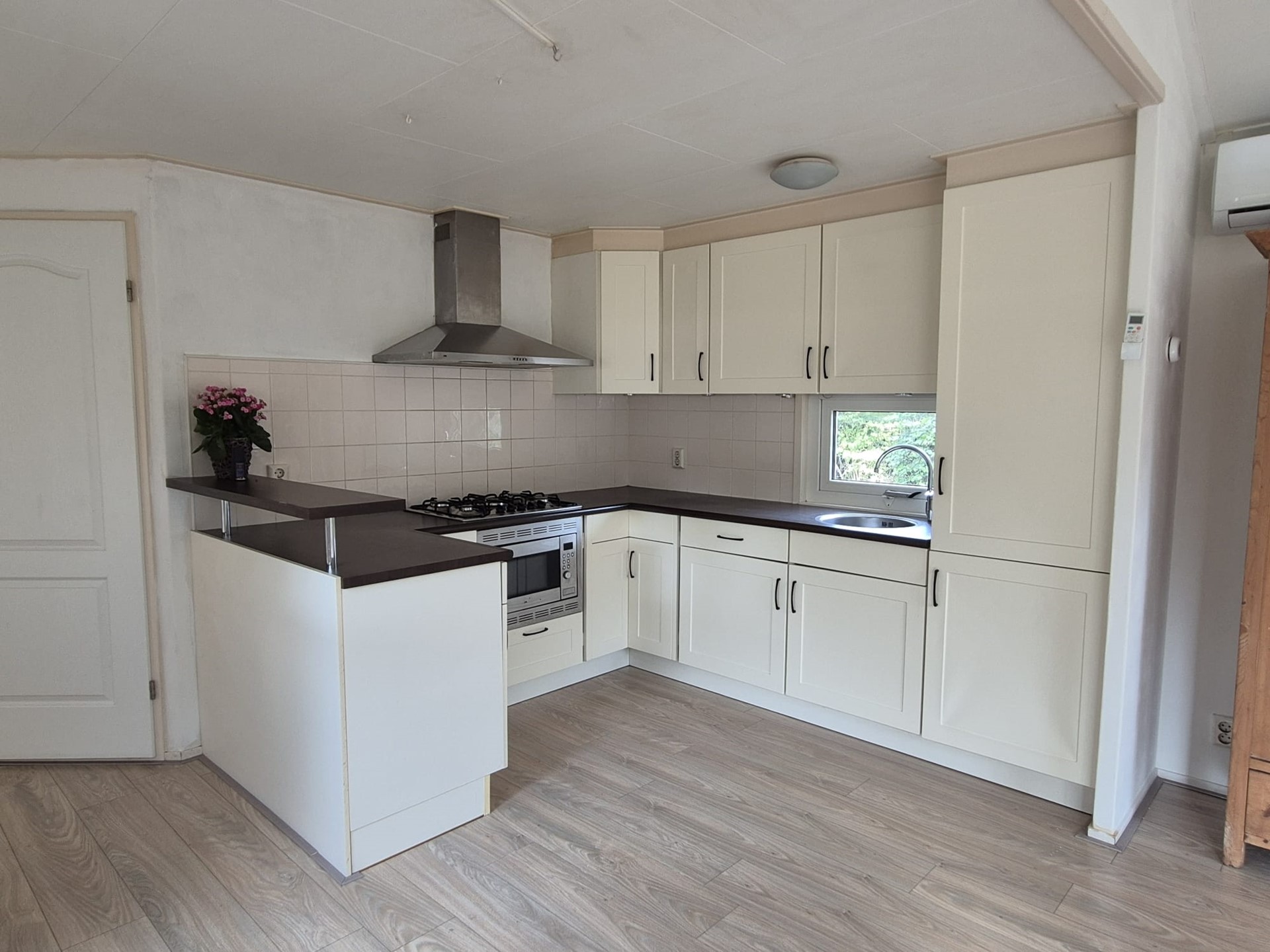 De keuken bevindt zich in dezelfde ruimte als de woonkamer. Deze beschikt over een U-vormig aanrechtblad en is voorzien van een gasfornuis met afzuigkap, ingebouwde oven en koelkast, spoelbak en tal van lades en kastjes. Hiermee is er voldoende opbergruimte aanwezig in de keuken, wat een geordende werkruimte creëert.
