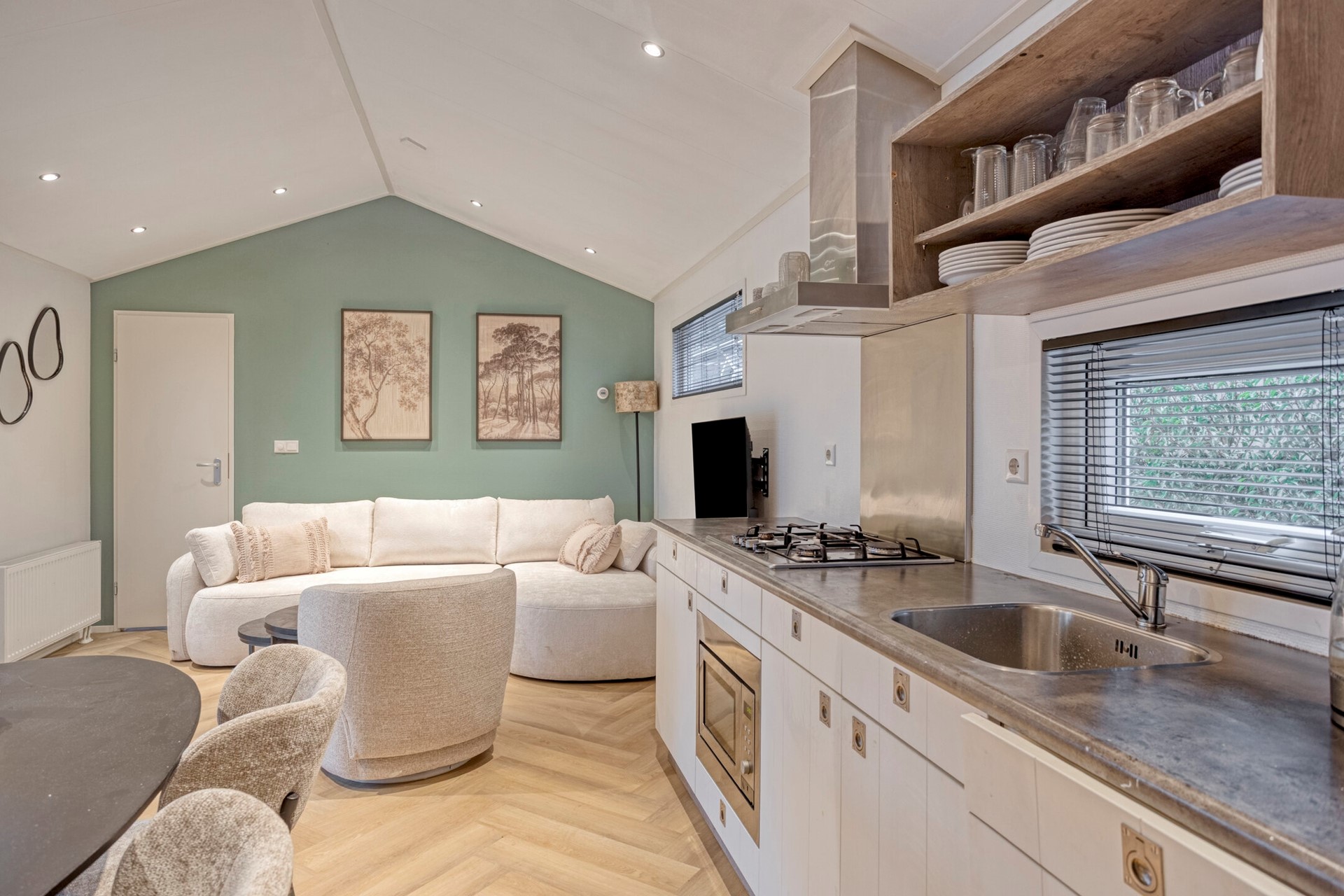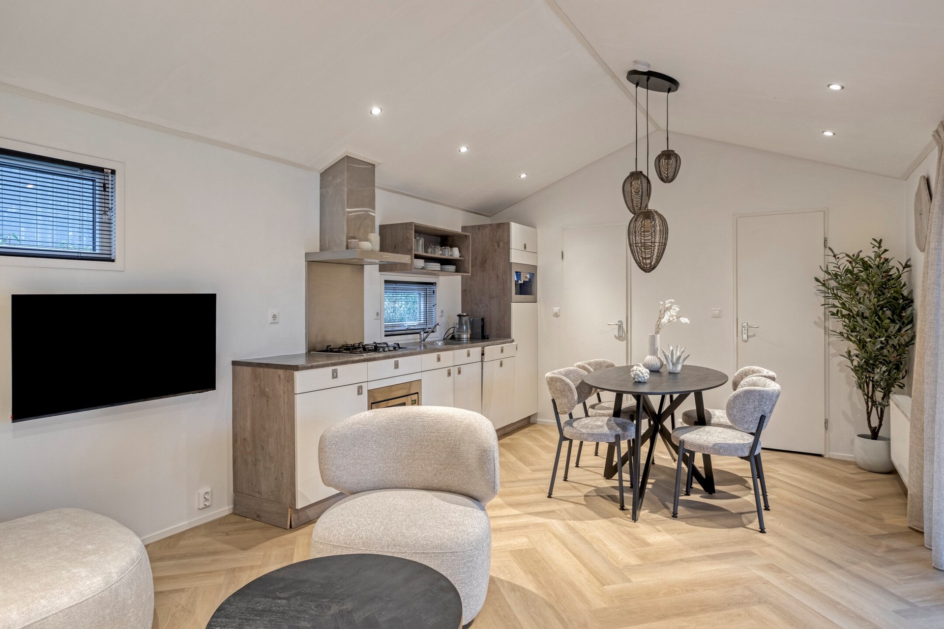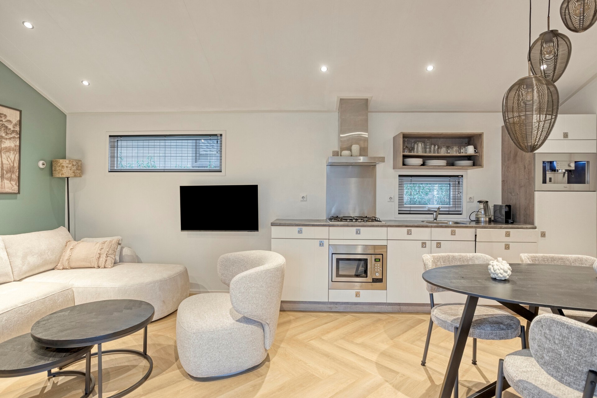 Via de veranda loopt u direct het leefgedeelte binnen, waar woonkamer, eetruimte en keuken op een natuurlijke manier in elkaar overlopen. Grote raampartijen en openslaande tuindeuren zorgen voor een prettige lichtinval en versterken het contact met buiten, terwijl de moderne afwerking en de visgraatvloer zorgen voor een rustige, tijdloze uitstraling. Er is voldoende ruimte voor een sfeervolle zithoek en voor een comfortabele eethoek bij de keuken.