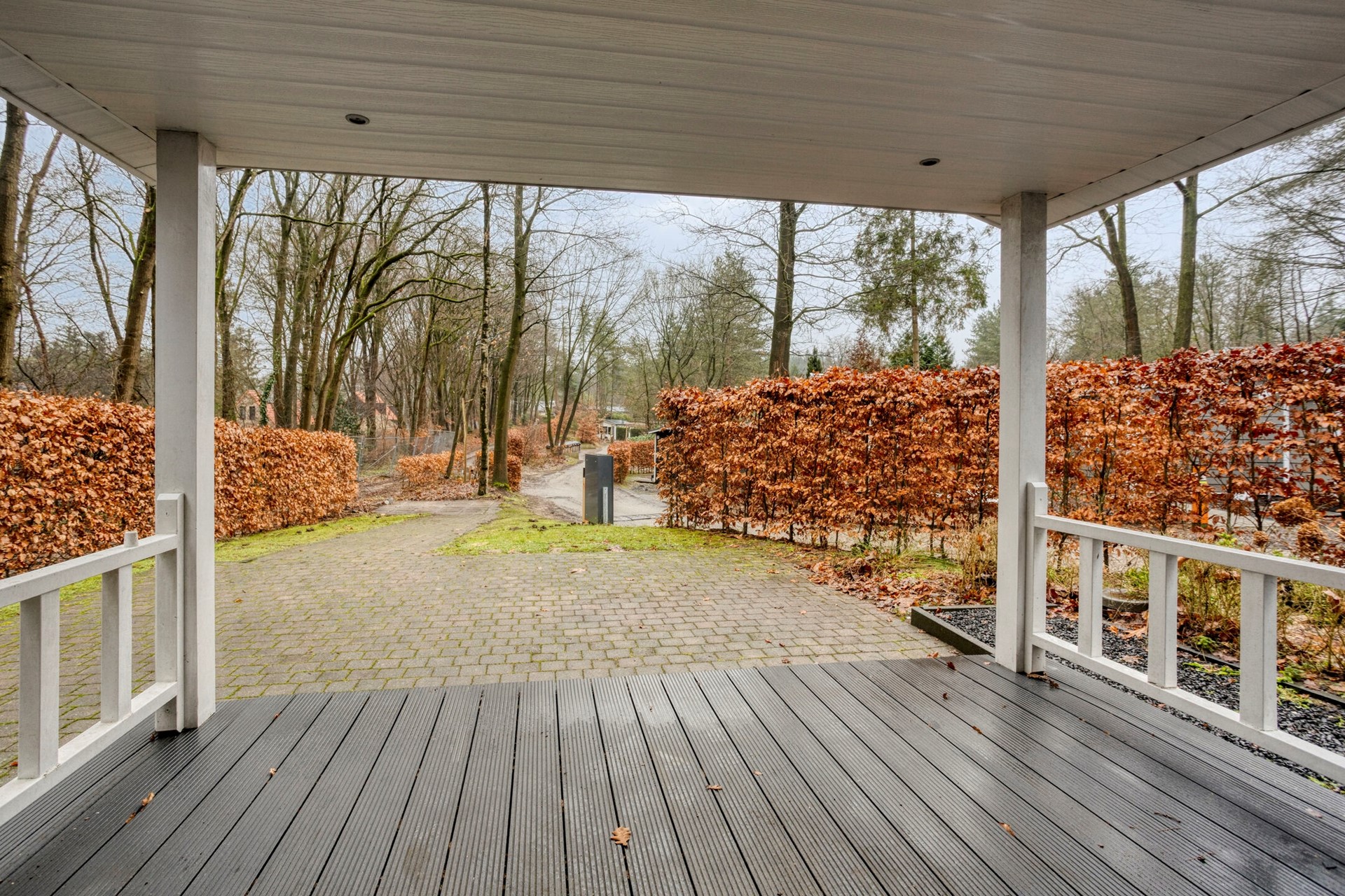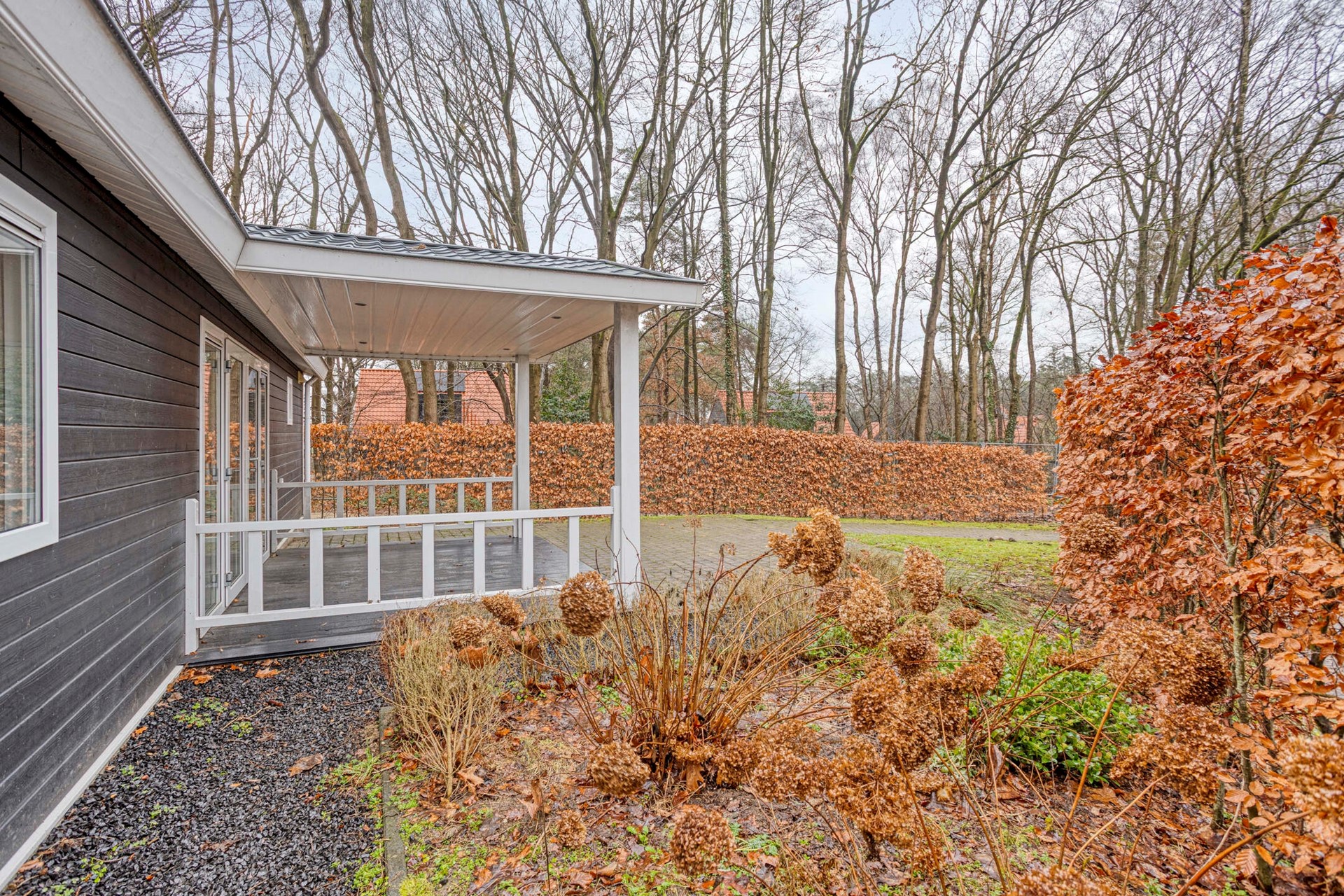 De buitenruimte is zonder twijfel een van de grote pluspunten van deze woning. Het perceel biedt volop privacy en wordt omringd door groen, waardoor u hier echt het gevoel heeft midden in de natuur te verblijven. Aan de woning grenst een overdekte veranda, een fijne plek om beschut buiten te zitten, ongeacht het seizoen. De tuin biedt meerdere mogelijkheden om zitplekken te creëren, te genieten van de zon of juist de schaduw op te zoeken. Dankzij de rustige ligging en natuurlijke begroeiing is dit een plek waar ontspanning vanzelfsprekend wordt en waar u de drukte moeiteloos achter u laat.