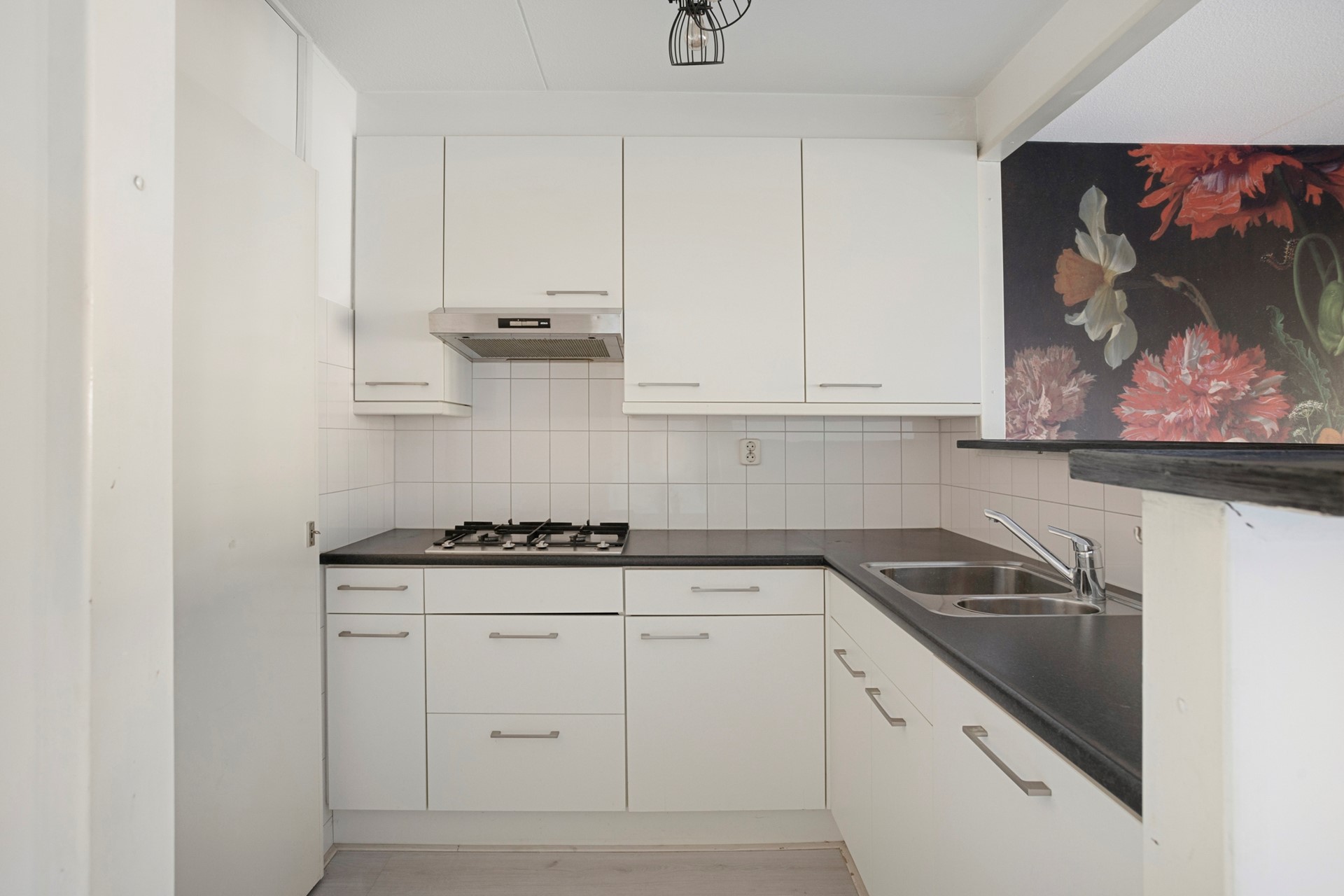 Aangrenzend aan de woonkamer bevindt zich de open keuken met een praktisch L-vormig aanrechtblad. De keuken is voorzien van een gasfornuis met afzuigkap, een vaatwasmachine en een spoelbak en biedt voldoende opbergruimte in de lades en kastjes. De keuken is direct bruikbaar, terwijl er tegelijkertijd voldoende ruimte is om deze op termijn verder te vernieuwen of aan te passen aan uw persoonlijke smaak.