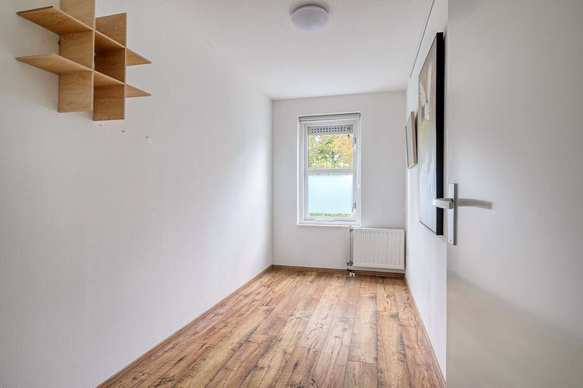 Bij binnenkomst valt direct de prettige lichtinval op. De ruime woonkamer heeft grote raampartijen en een tuindeur naar het terras, waardoor binnen en buiten naadloos in elkaar overlopen. Vanuit uw zithoek kijkt u uit op het groene plantsoen, wat een gevoel van rust en privacy geeft. De eethoek sluit aan op de halfopen keuken, die is ingericht met crèmekleurige fronten, een donker werkblad en diverse inbouwapparatuur zoals een gaskookplaat, oven, afzuigkap en koelkast.
