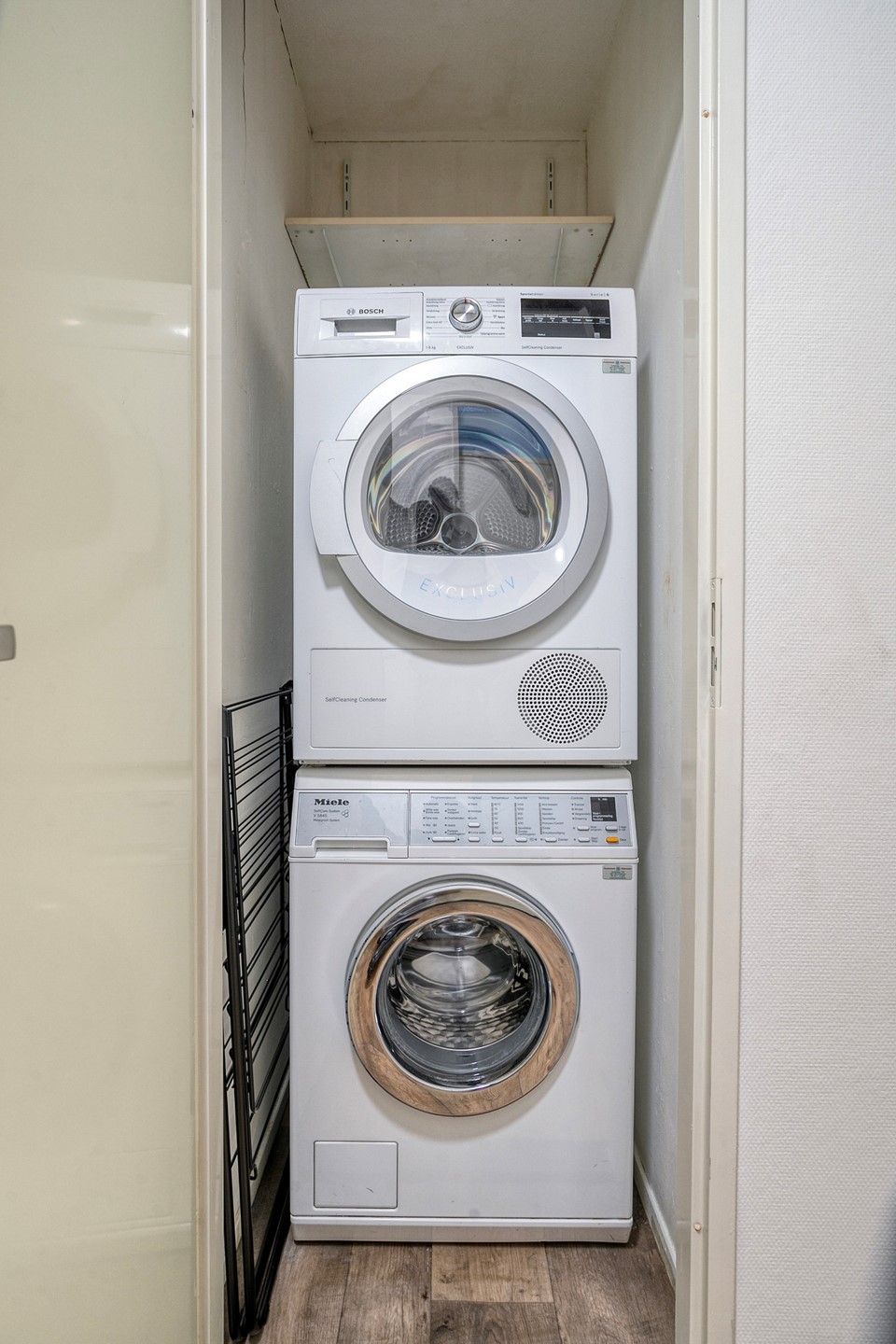 De hal geeft toegang tot de twee slaapkamers, beide met een rustige uitstraling en nette afwerking. Er is voldoende ruimte voor een tweepersoonsbed in de hoofdslaapkamer; deze is tevens voorzien van een inbouwkast. De tweede slaapkamer is ideaal als logeerkamer of werkplek. De badkamer is, evenals het toilet, modern en strak afgewerkt met grote betonlook tegels, een wastafelmeubel met dubbele kraan, inloopdouche en designradiator. Daarnaast is er een praktische bergkast met ruimte voor wasapparatuur.
