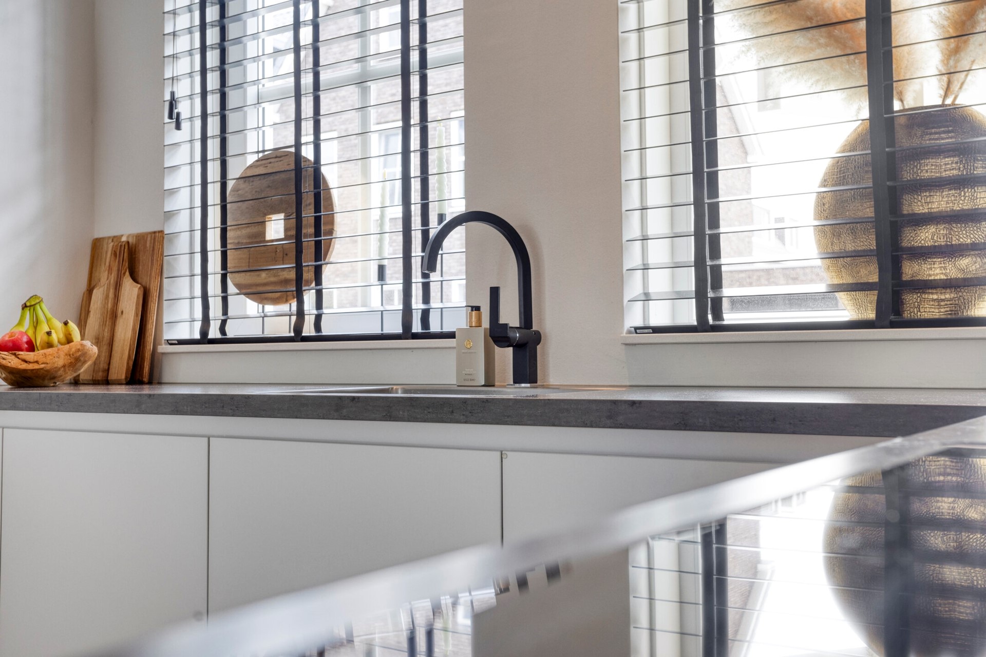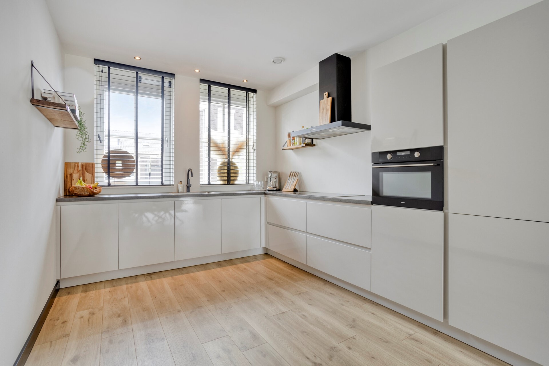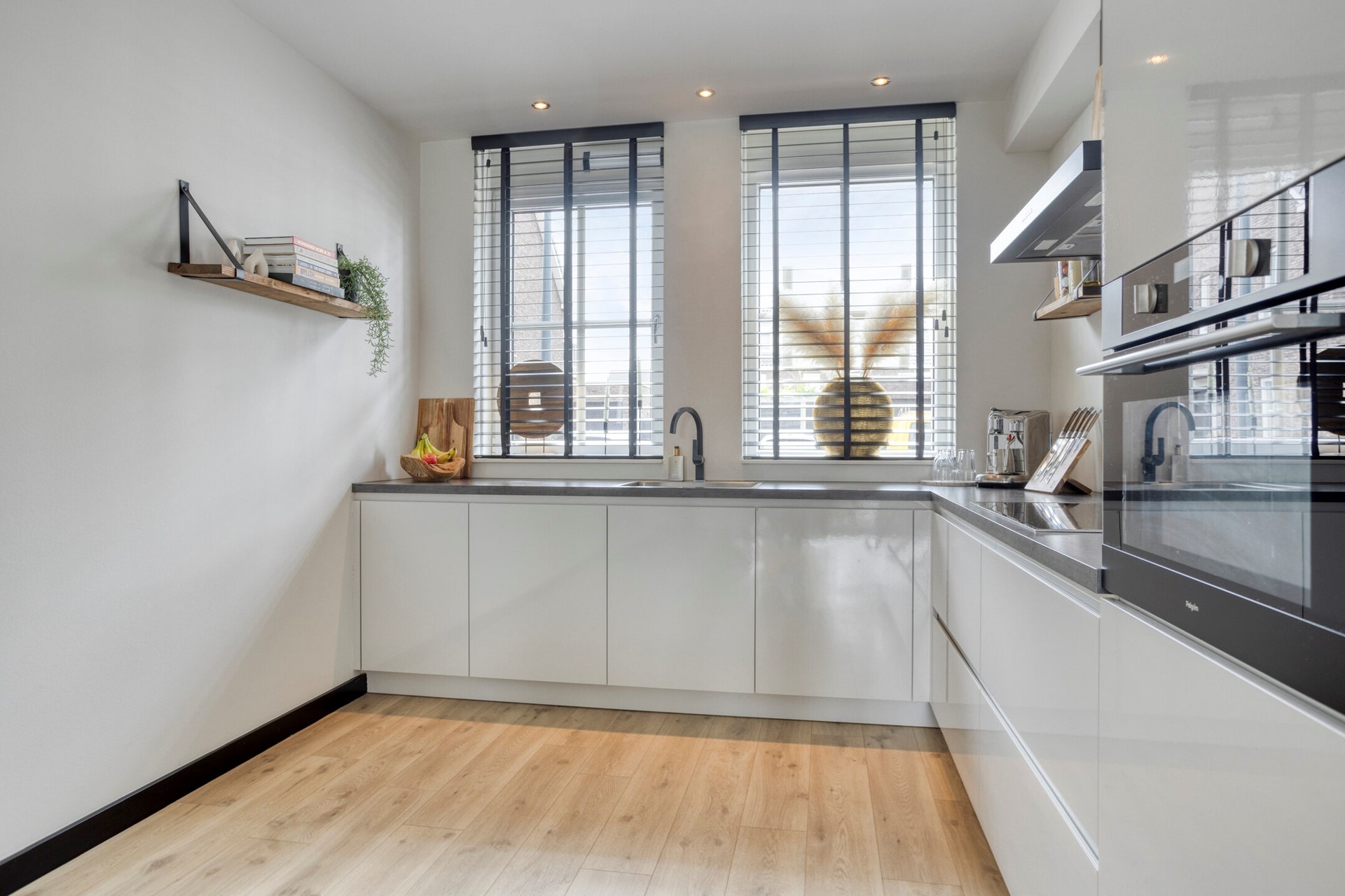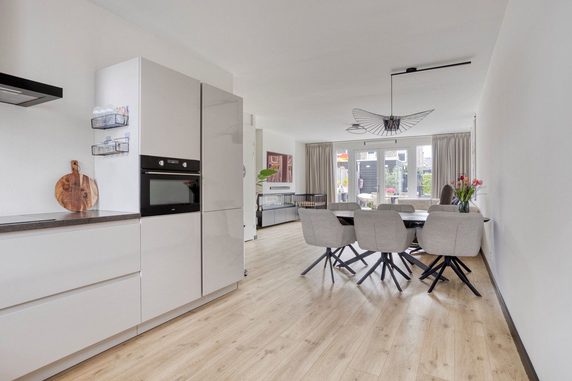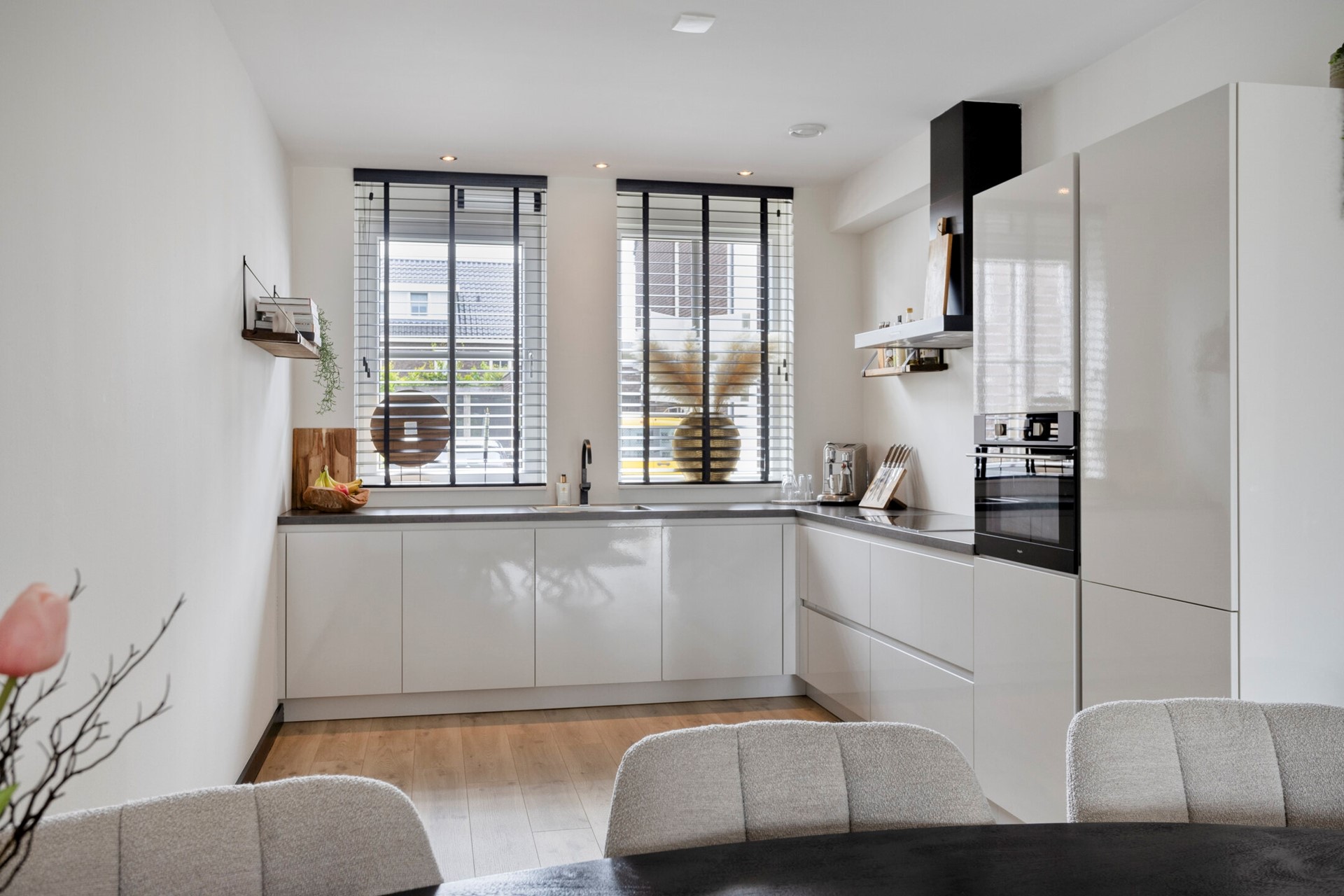 Aan de voorzijde vindt u de keuken, die dankzij de open indeling in verbinding staat met de woonkamer. De L-vormige opstelling is voorzien van moderne inbouwapparatuur, waaronder een inductiekookplaat met afzuigkap, een ovencombinatie, vaatwasser, koelkast en een spoelbak met kraan. Ook beschikt u over voldoende opbergruimte in de kasten en lades, zodat alles netjes kan worden opgeborgen.