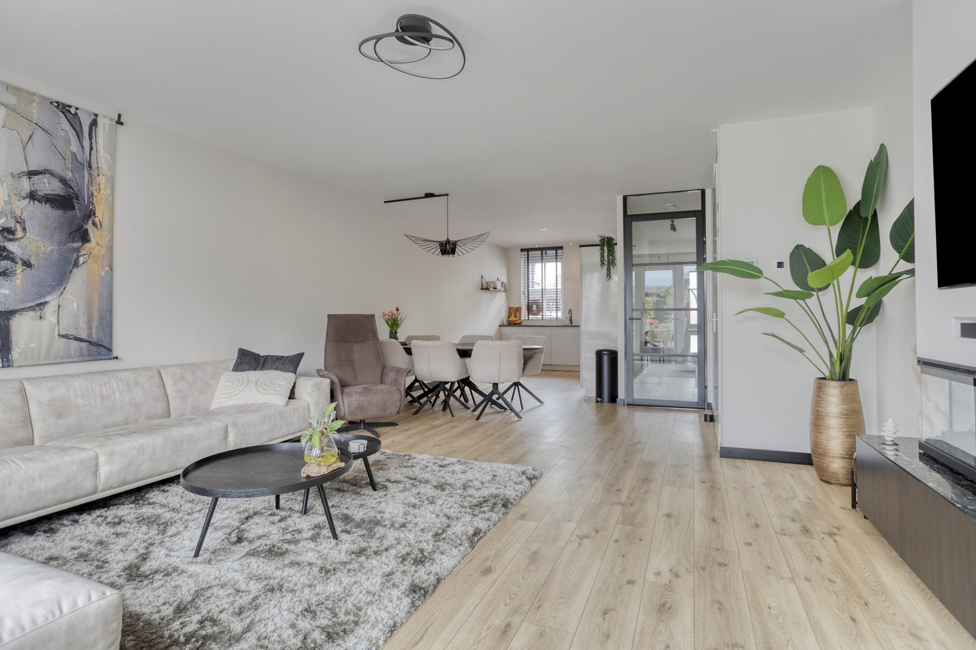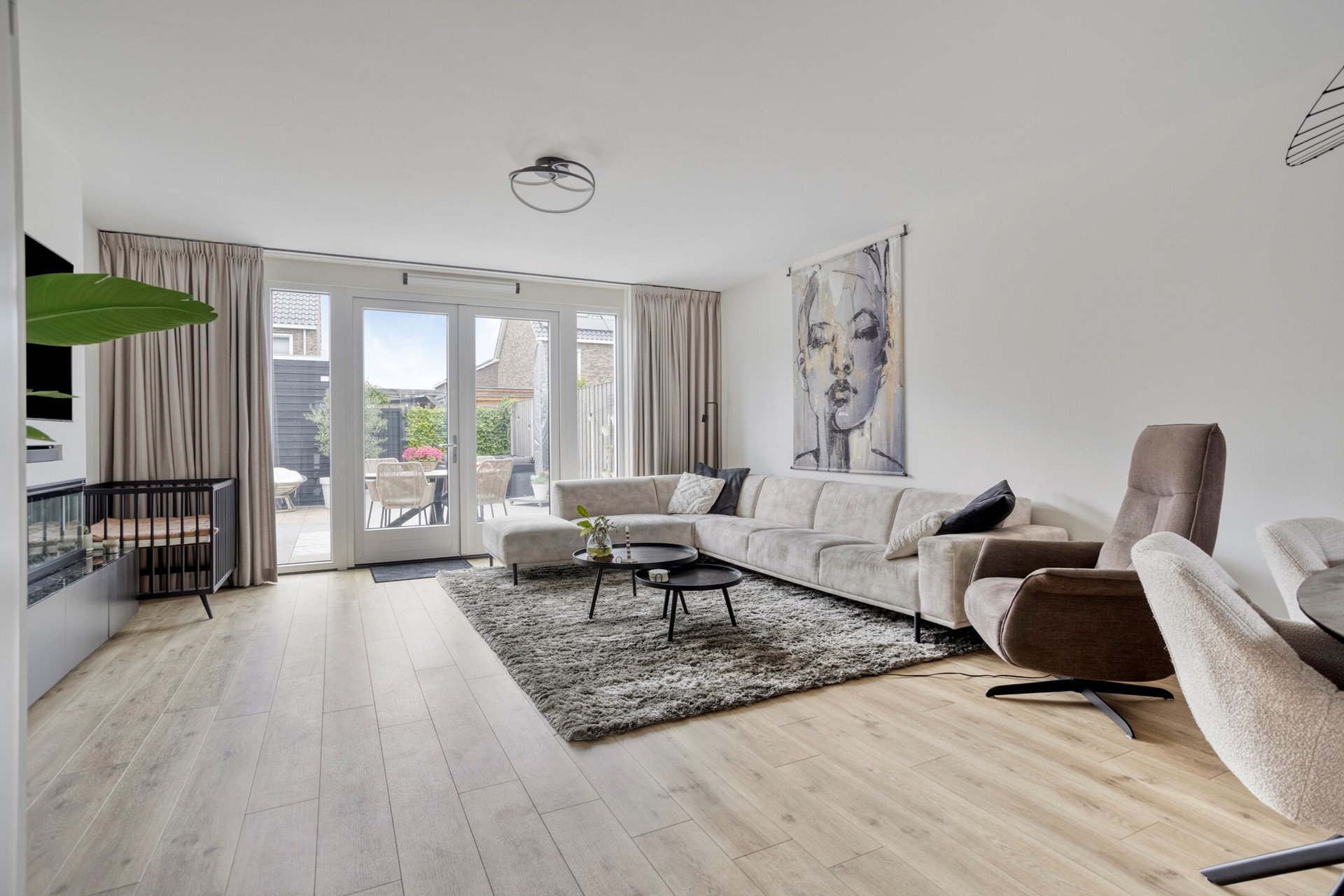 In de woonkamer geniet u van veel lichtinval door de ramen rondom en de openslaande deuren naar de tuin. De open indeling biedt volop mogelijkheden voor een gezellige zithoek en een ruime eethoek. Een ingebouwde haard vormt de sfeervolle eyecatcher, waardoor dit de ideale plek wordt om te ontspannen of gasten te ontvangen.