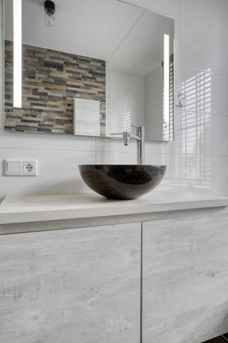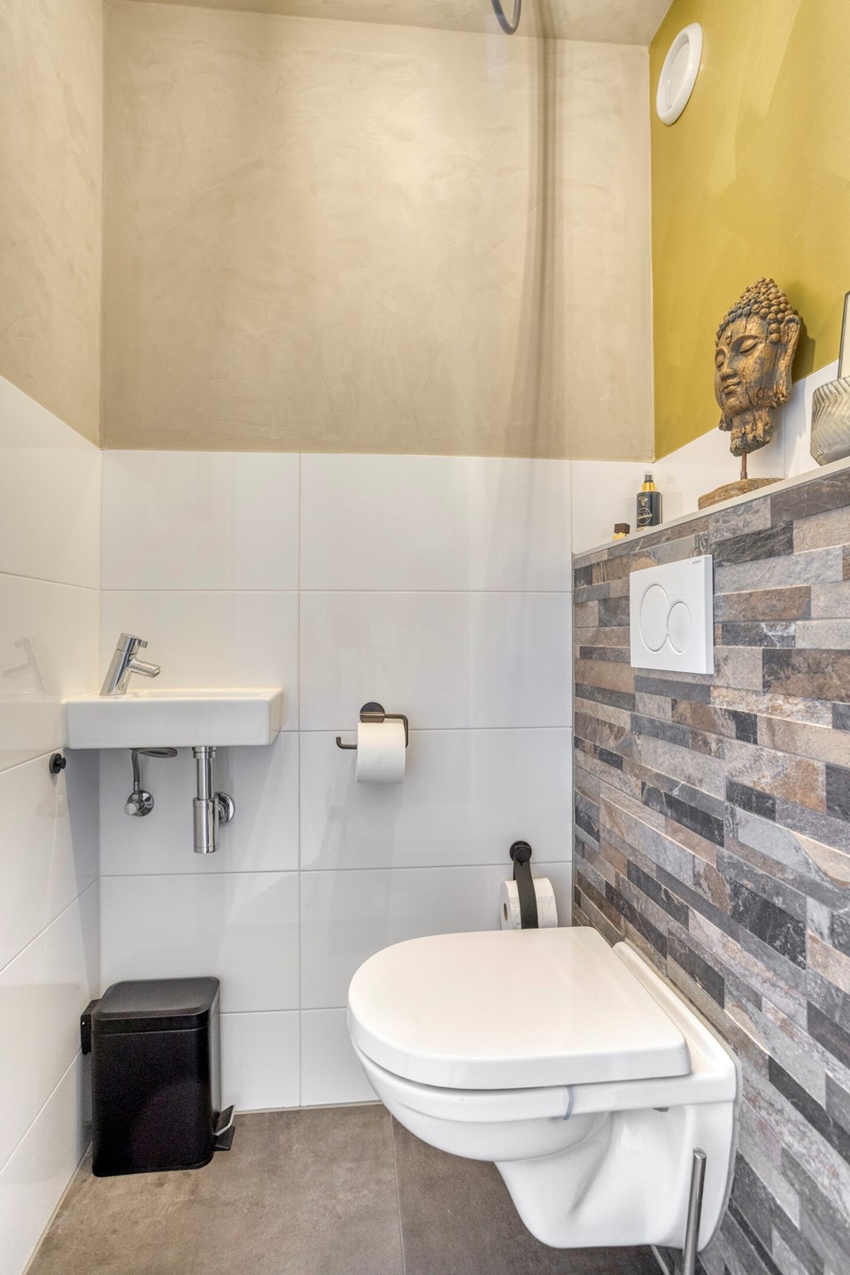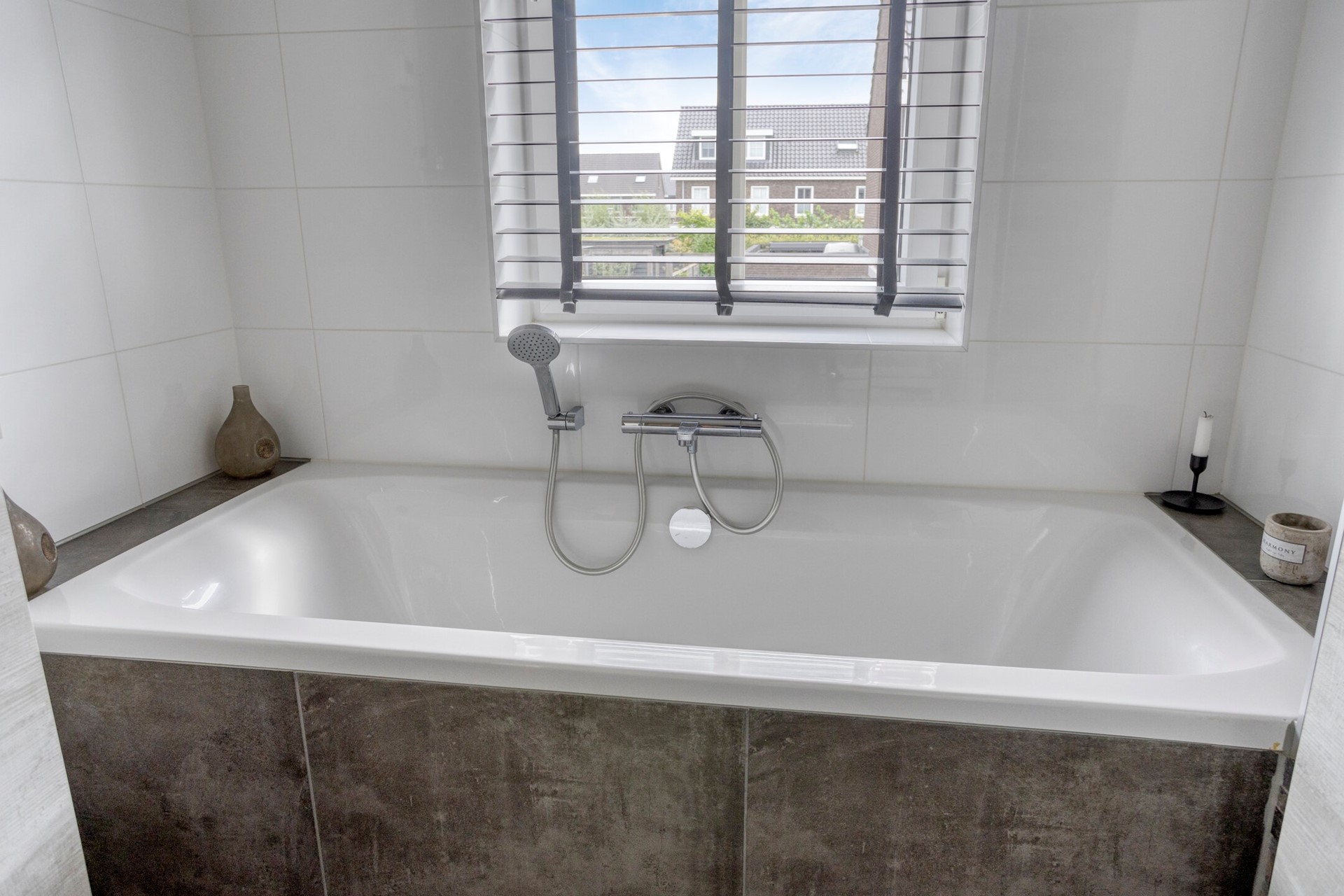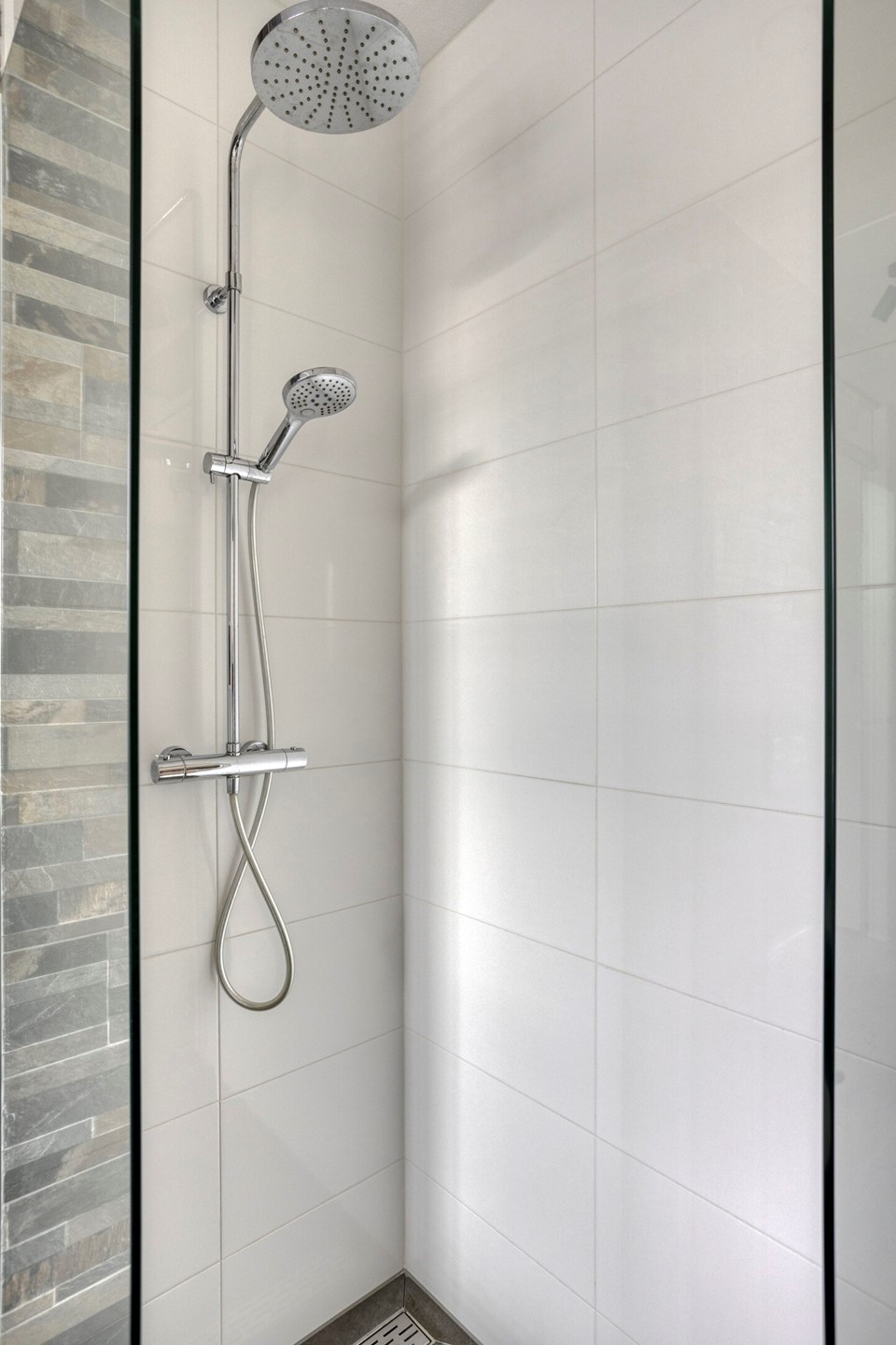 Grenzend aan de overloop ligt de moderne badkamer. Deze is volledig betegeld en beschikt over een ligbad, een douche met glazen wand, een zwevend toilet en een wastafel. De afwerking is eigentijds en goed onderhouden, waardoor u hier dagelijks comfortabel gebruik van kunt maken.
