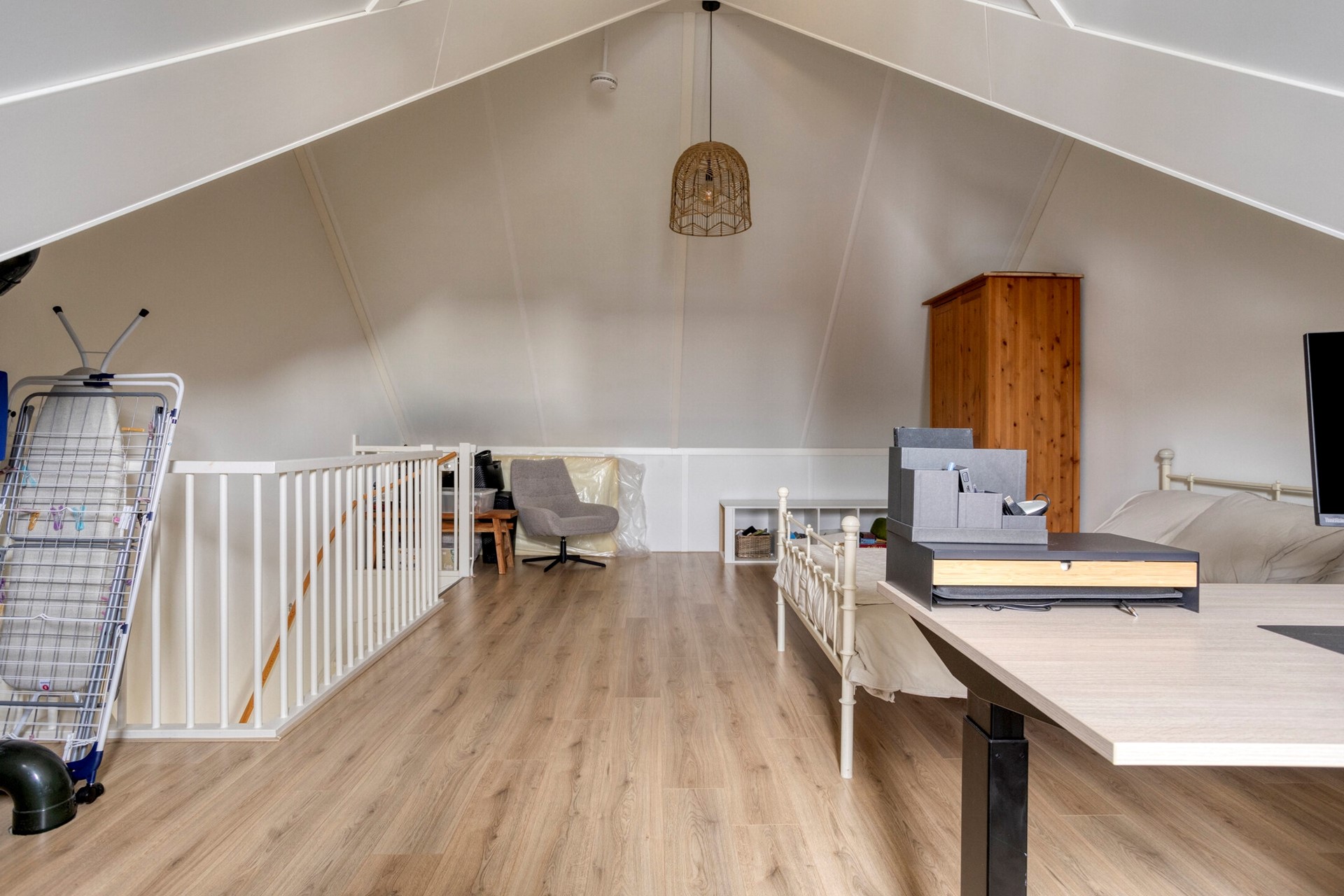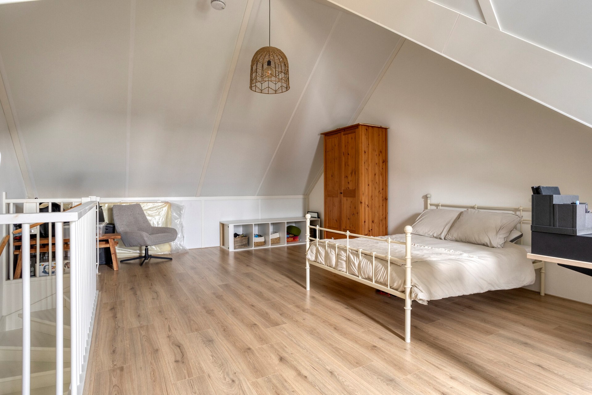 Een vaste trap leidt u naar de tweede verdieping. Deze verdieping bestaat uit één royale slaapkamer die over de gehele verdieping loopt. Dankzij de ramen is de ruimte opvallend licht en goed bruikbaar als slaapkamer, hobbyruimte of kantoor. Bovendien is er een aansluiting voor witgoed aanwezig, waardoor deze verdieping desgewenst ook als wasruimte kan worden ingericht. Door de grote ruimte kunnen hier gemakkelijk extra kamers gerealiseerd worden.