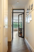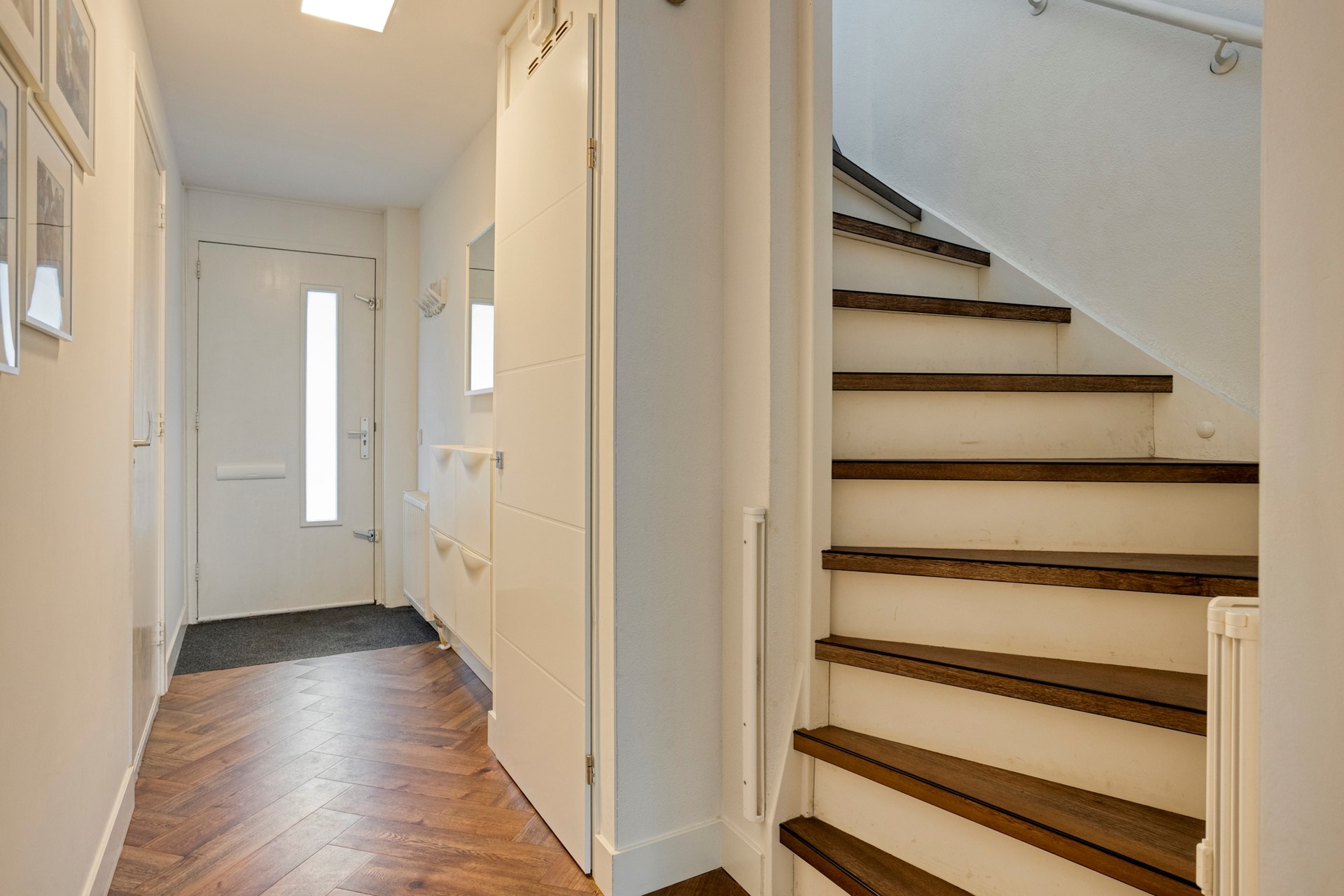 De overdekte entree geeft toegang tot een lichte hal met moderne toiletruimte (2021), de inpandige garage en de trap naar de eerste verdieping. Een stijlvolle deur leidt u naar de woonkamer.