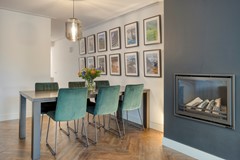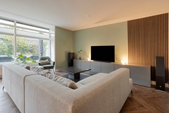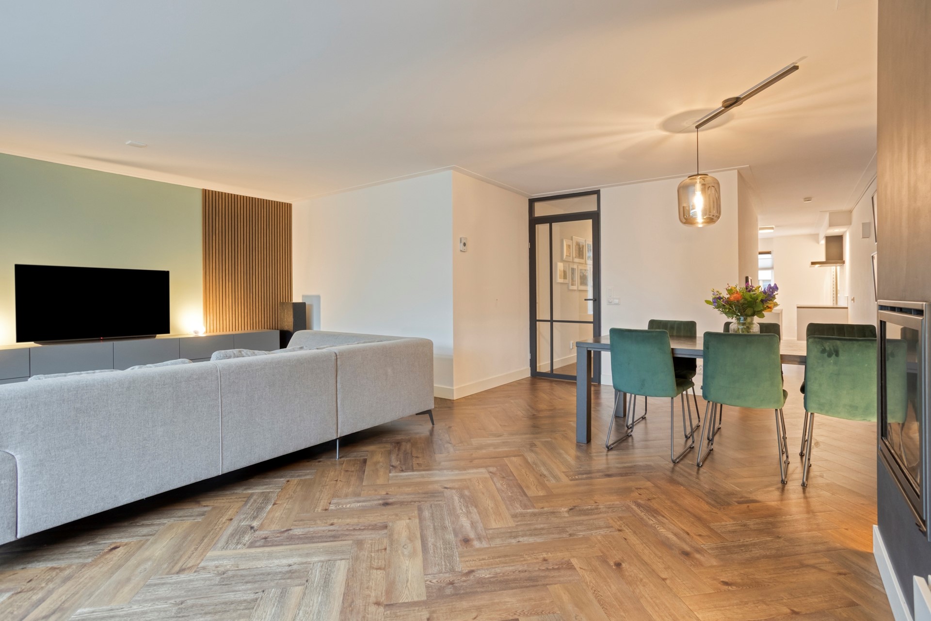 Zodra u binnenstapt, valt de rust op: de doorlopende visgraatvloer, zachte kleuren en veel licht door de grote raampartijen. De woonkamer is ruim en gezellig, met een haard als sfeermaker. De woonkamer staat in directe verbinding met de tuin – ideaal voor zomerse dagen of een etentje buiten. Aan de voorzijde ligt de keuken (2018), strak uitgevoerd in hoogglans wit met een donker werkblad. Hier vindt u alle moderne inbouwapparatuur – een combi-oven, inductiekookplaat, afzuigkap, koel-/vriescombinatie en vaatwasser – en voldoende werkruimte om uitgebreid te koken. De indeling zorgt voor een natuurlijke verbinding tussen koken, eten en wonen.