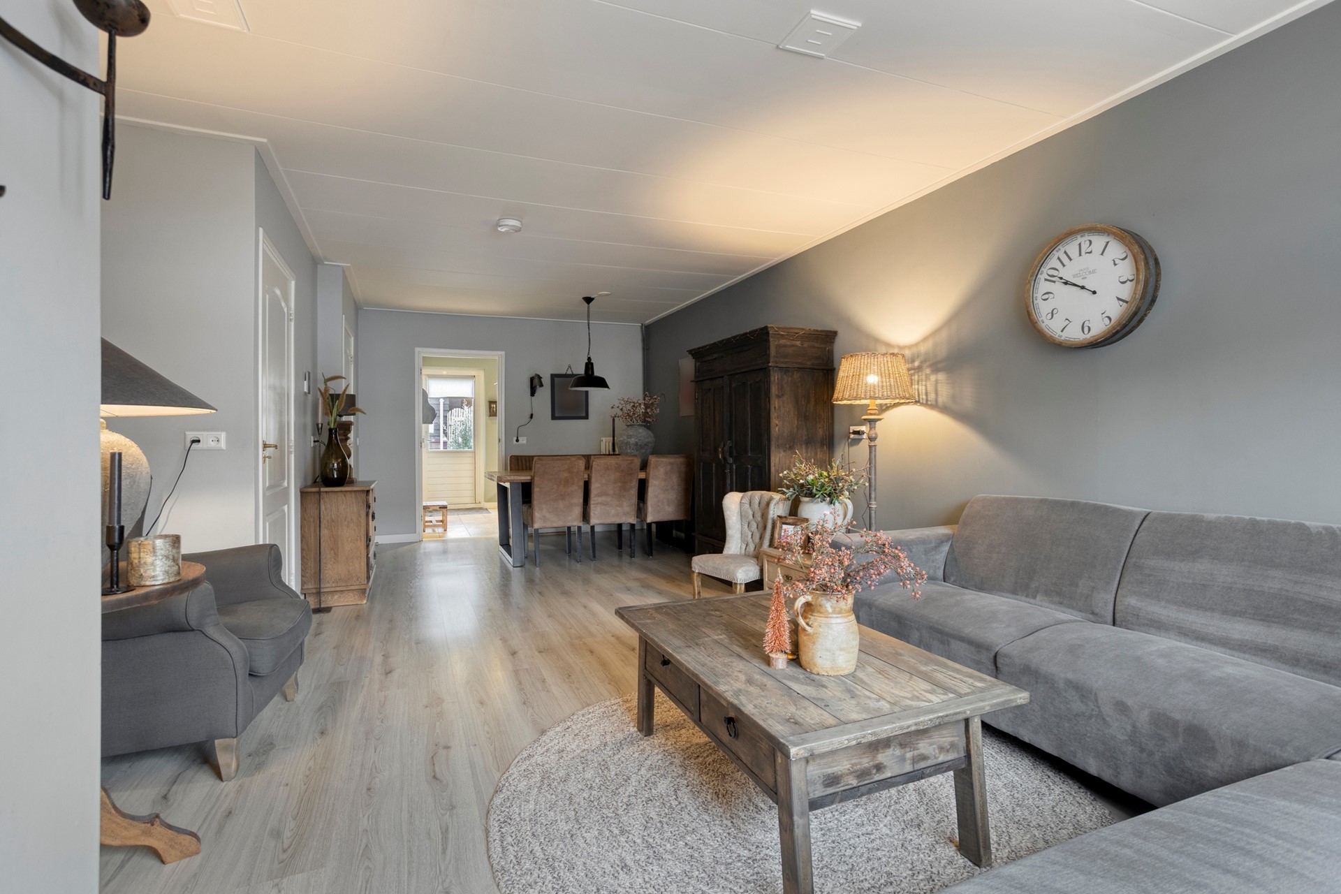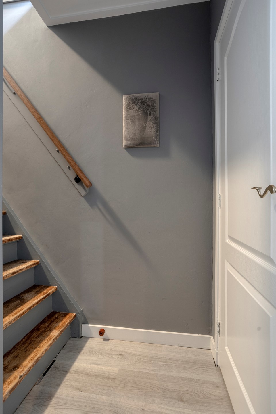 De entree geeft toegang tot een compacte hal met de meterkast, waarna u doorloopt naar de verrassend ruime woonkamer. Het lichtinval via het grote voorraam zorgt voor veel licht in de woonkamer, en er is genoeg ruimte voor een sfeervolle indeling waar wonen en eten moeiteloos in elkaar kunnen overlopen. Aan de achterzijde bereikt u de landelijke keuken, uitgevoerd in een zachte tint en voorzien van een combi-oven, gaskookplaat, schouwafzuigkap, vaatwasser, koelkast en veel bergruimte. De keuken biedt tevens toegang tot een kantoorruimte en de achtertuin. Vanuit de tussenhal bereikt u het moderne toilet en de trap naar boven.