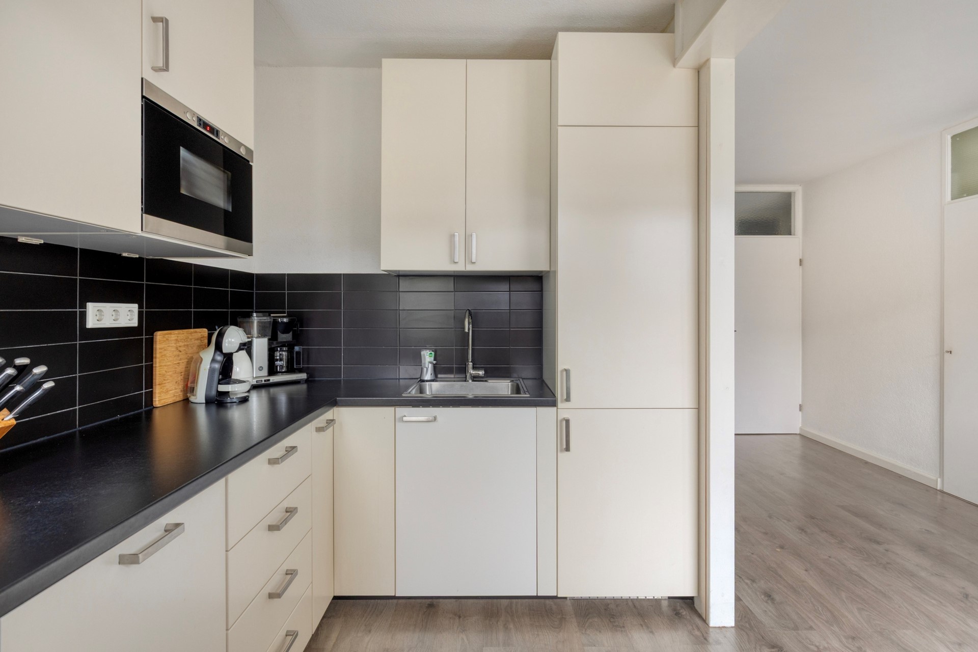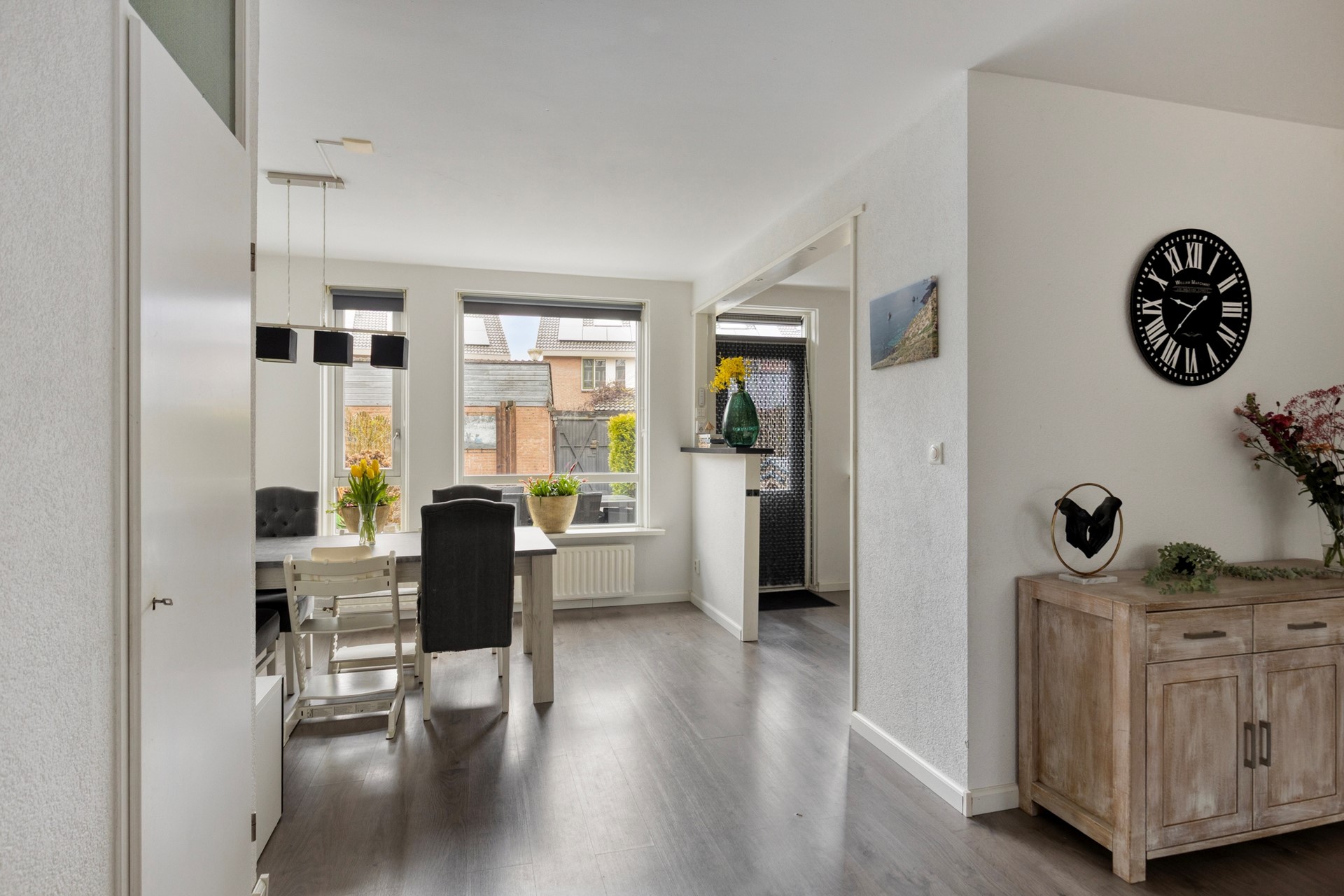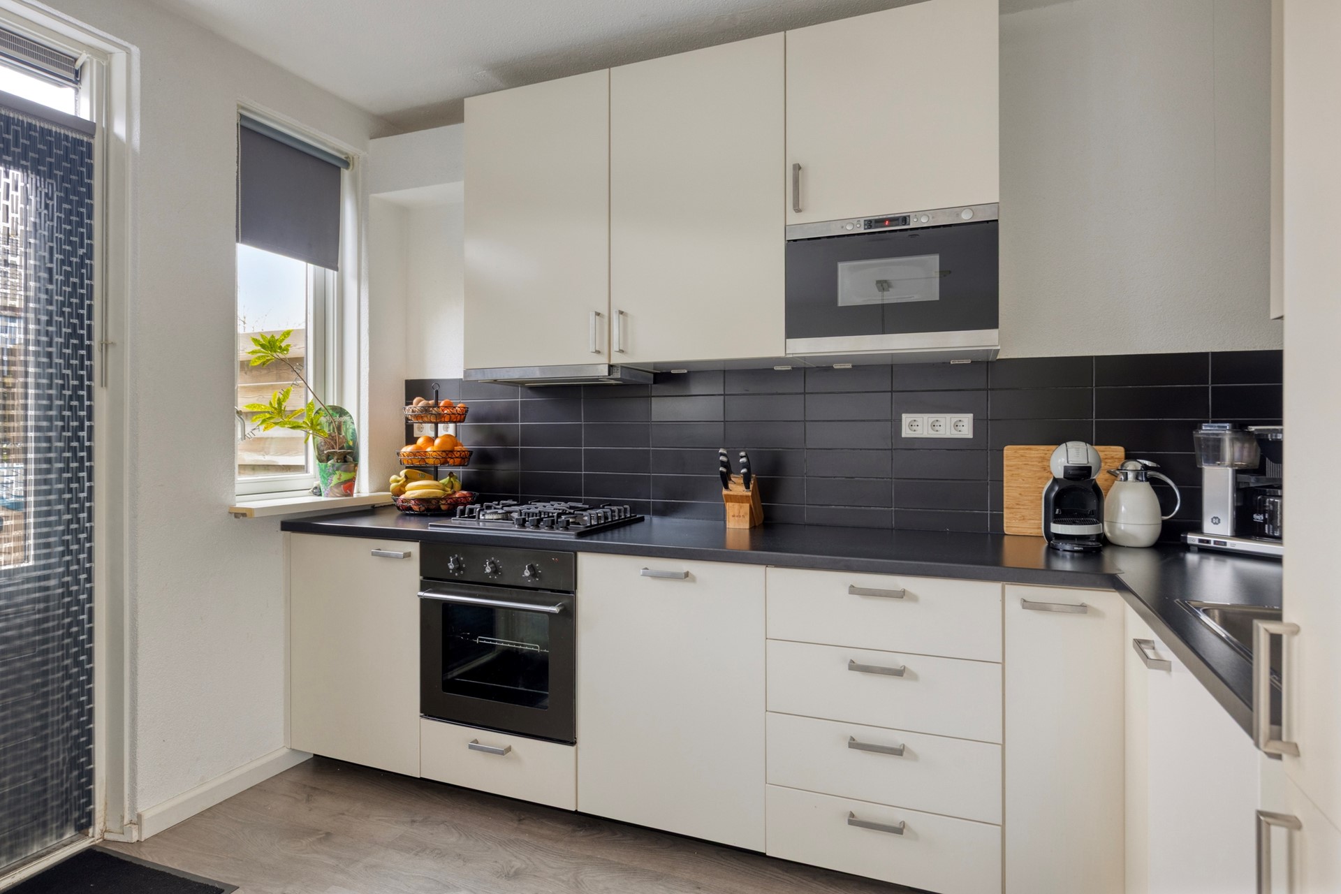 Via de verzorgde voortuin betreedt u de woning en komt u binnen in de hal met meterkast, trapopgang en toilet met fonteintje. Vanuit hier loopt u door naar de woonkamer, waar grote raampartijen aan zowel de voor- als achterzijde zorgen voor een prettige lichtinval gedurende de dag. De ruimte is strak afgewerkt en biedt volop plaats voor een royale zithoek aan de voorzijde en een grote eettafel aan de tuinzijde. Aan de achterzijde sluit de open keuken naadloos aan. Deze is uitgevoerd in lichte fronten met een donker werkblad en voorzien van een gaskookplaat, vlakscherm afzuigkap, oven, magnetron, koel-/vriescombinatie en vaatwasser. Vanuit de keuken heeft u direct toegang tot de achtertuin.
