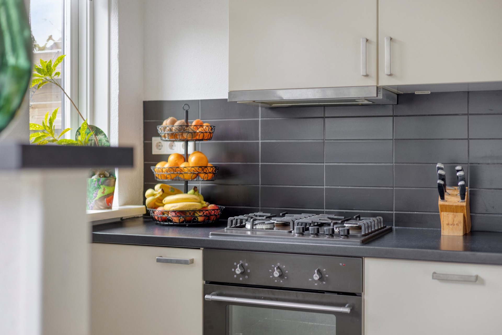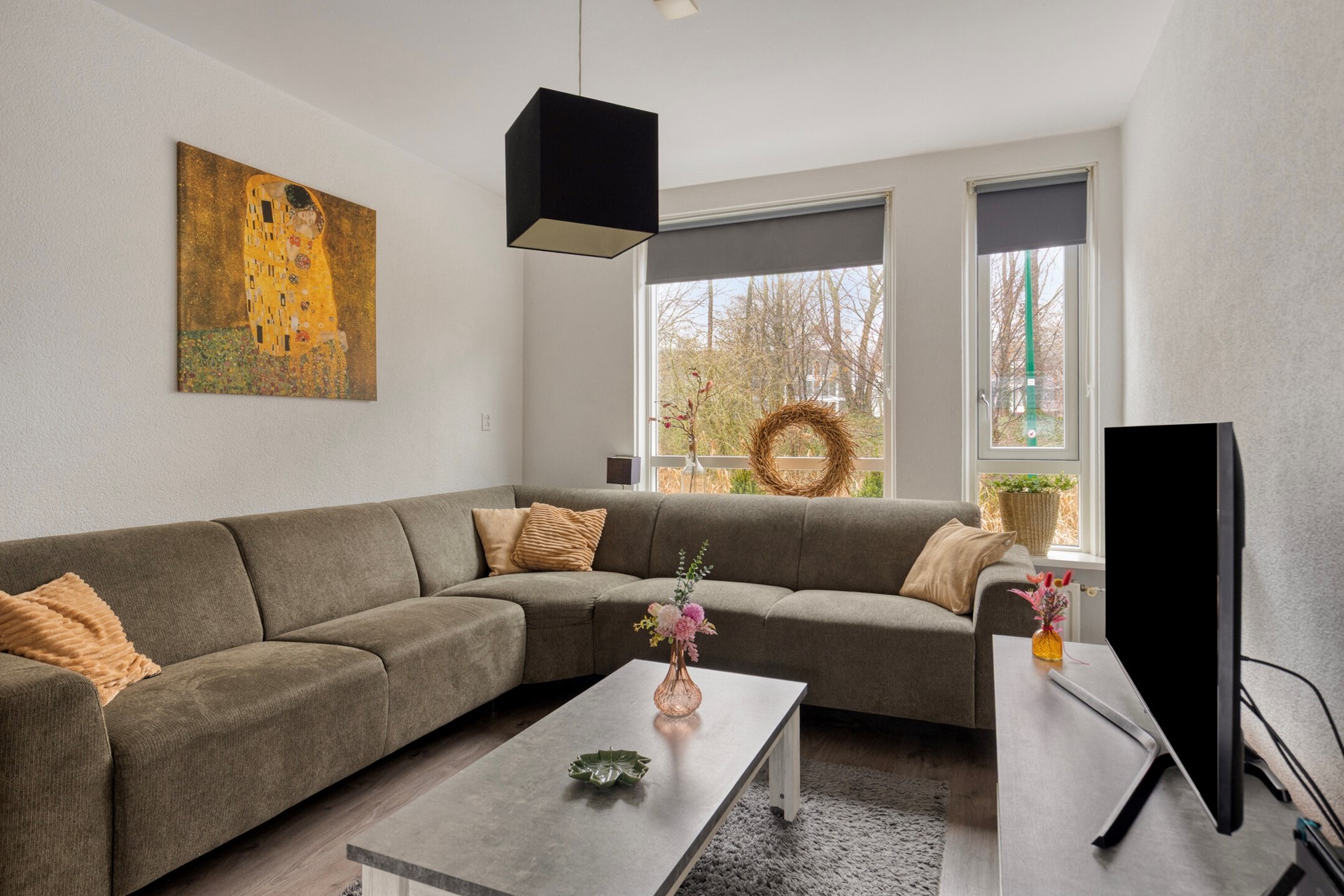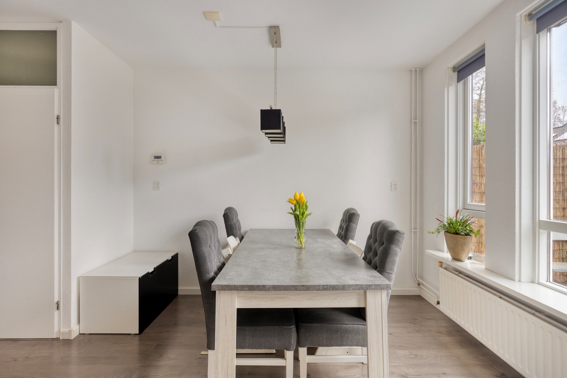 Via de verzorgde voortuin betreedt u de woning en komt u binnen in de hal met meterkast, trapopgang en toilet met fonteintje. Vanuit hier loopt u door naar de woonkamer, waar grote raampartijen aan zowel de voor- als achterzijde zorgen voor een prettige lichtinval gedurende de dag. De ruimte is strak afgewerkt en biedt volop plaats voor een royale zithoek aan de voorzijde en een grote eettafel aan de tuinzijde. Aan de achterzijde sluit de open keuken naadloos aan. Deze is uitgevoerd in lichte fronten met een donker werkblad en voorzien van een gaskookplaat, vlakscherm afzuigkap, oven, magnetron, koel-/vriescombinatie en vaatwasser. Vanuit de keuken heeft u direct toegang tot de achtertuin.