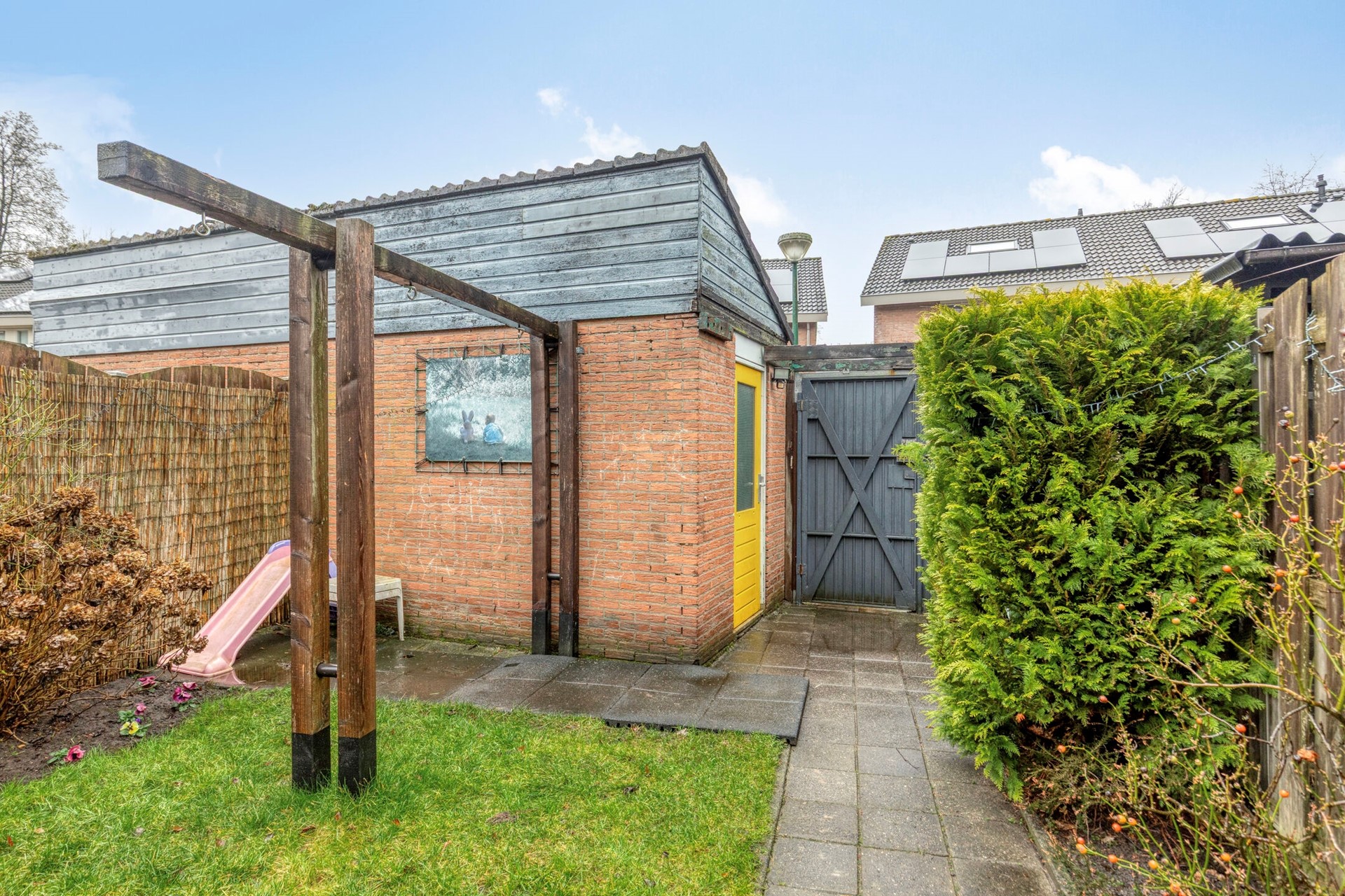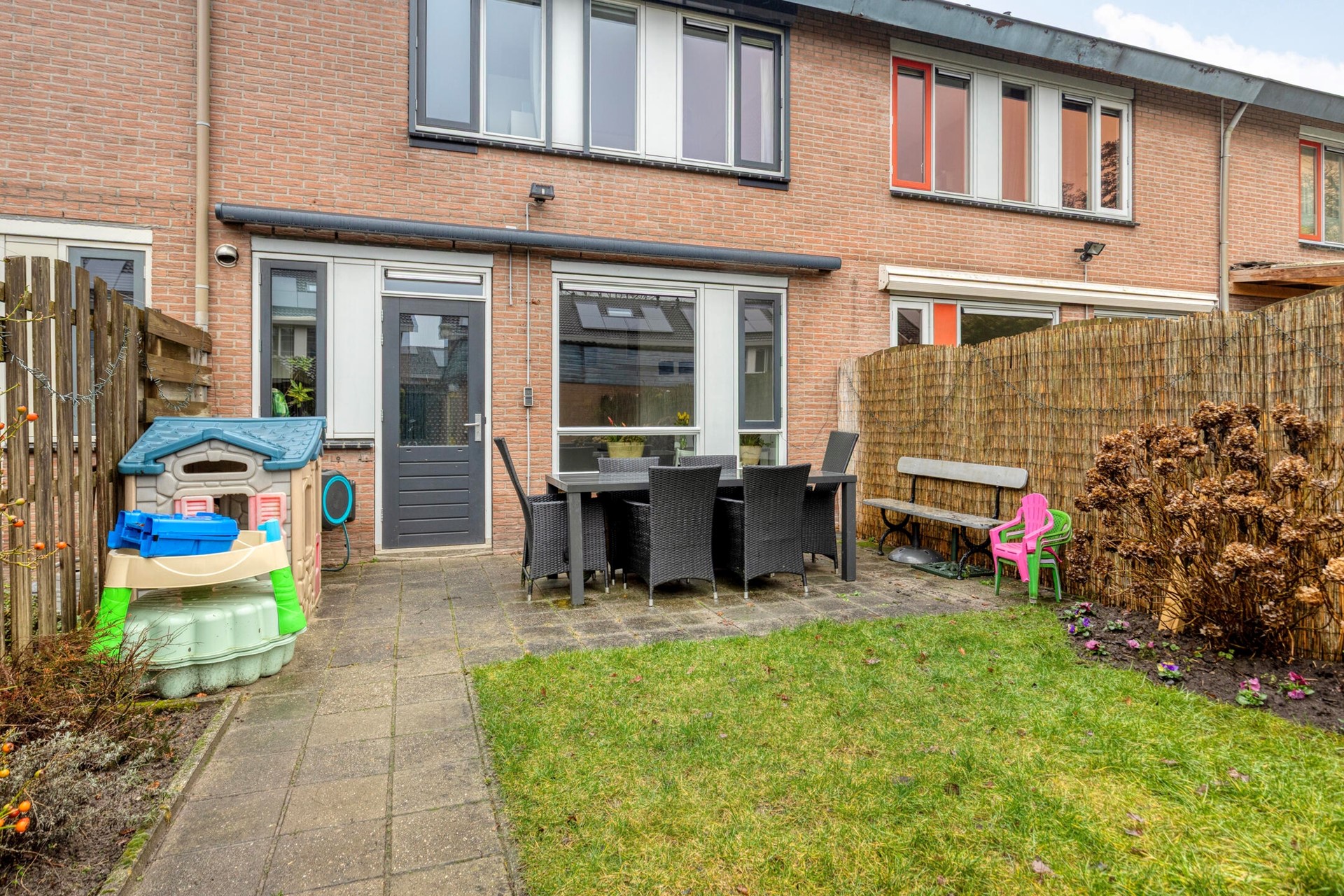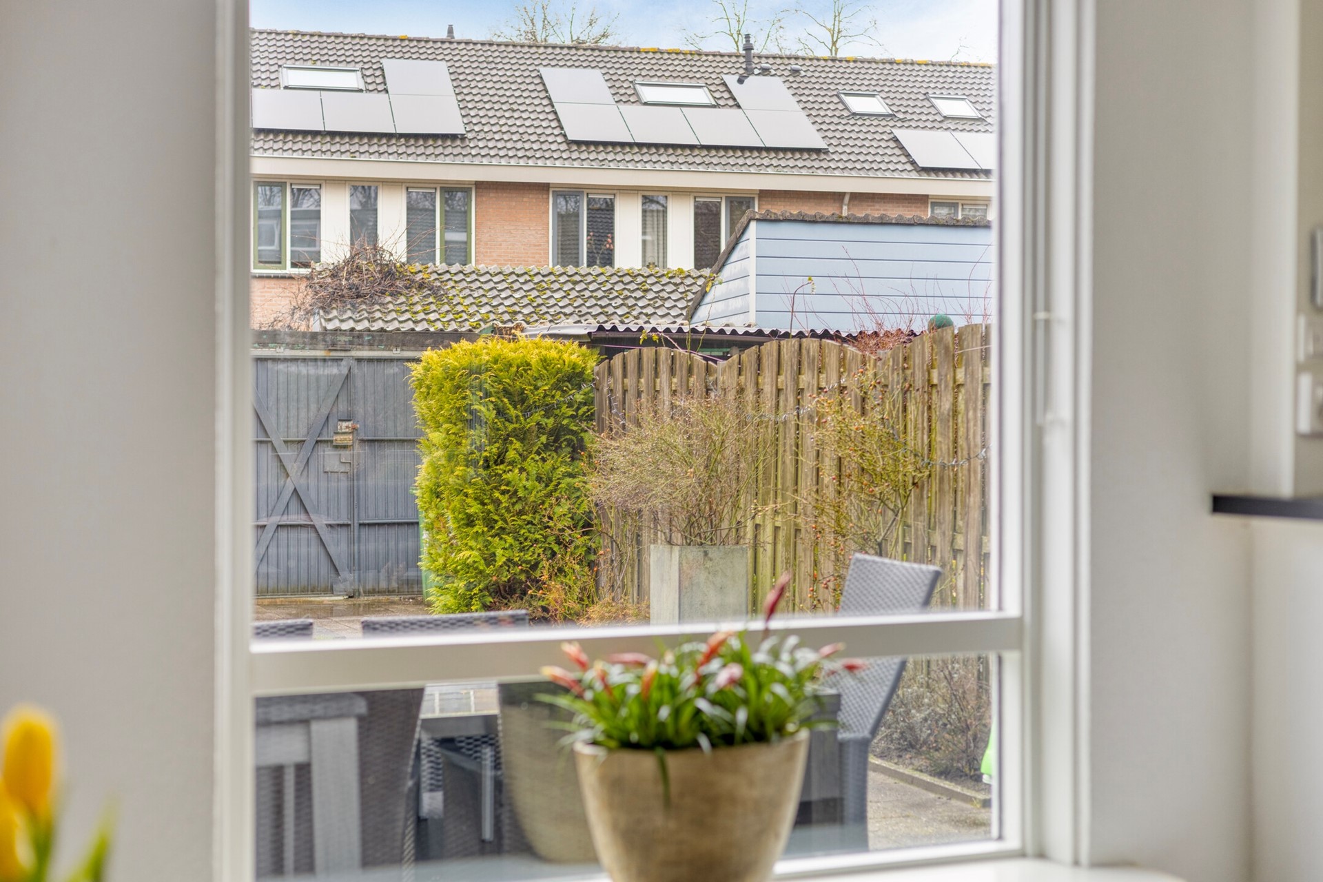 De achtertuin is overzichtelijk en verzorgd aangelegd met een combinatie van terras en gazon. Direct achter de woning bevindt zich een ruim terras waar u met gemak een grote eettafel plaatst voor gezellige diners buiten. Het gazon biedt speelruimte voor kinderen of plaats voor een trampoline. Achter in de tuin staat een vrijstaande berging, ideaal voor fietsen en tuingereedschap, en via de achterom is de tuin gemakkelijk bereikbaar. De erfafscheidingen zorgen voor privacy, waardoor u hier ongestoord kunt genieten van het buitenleven.