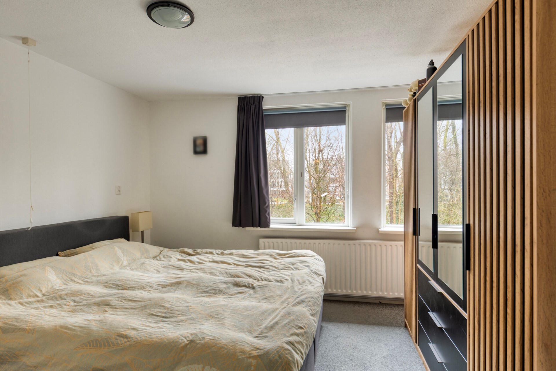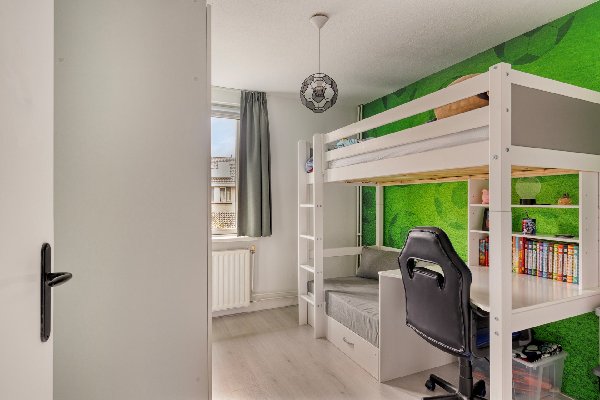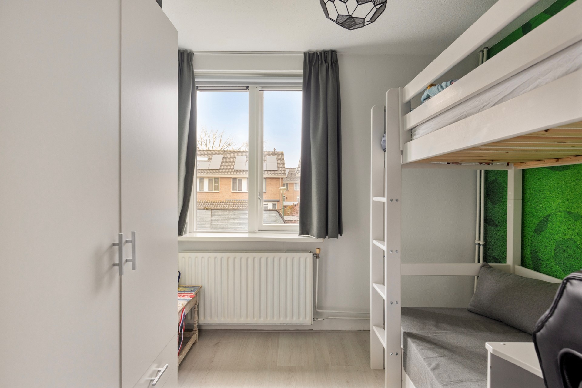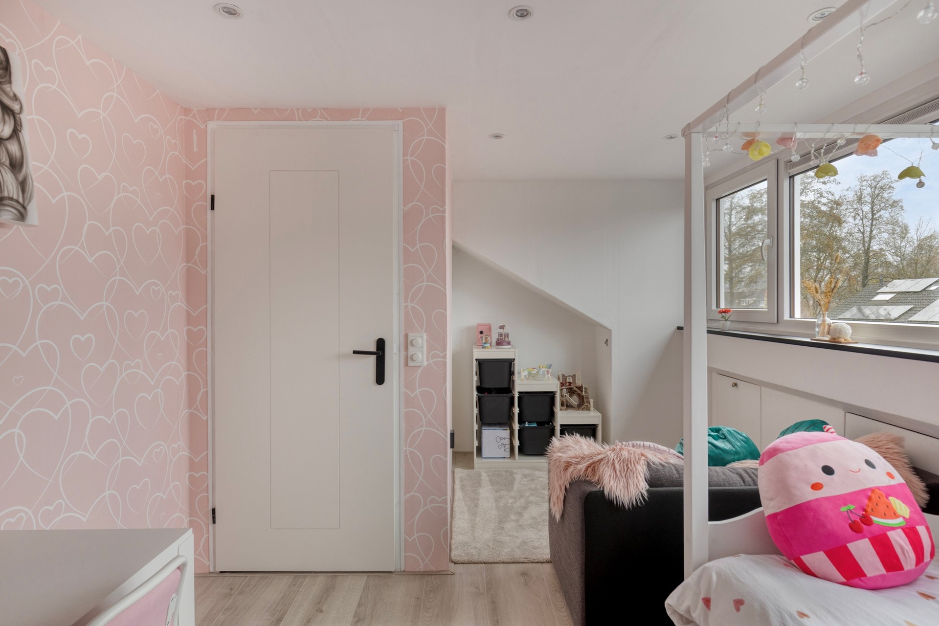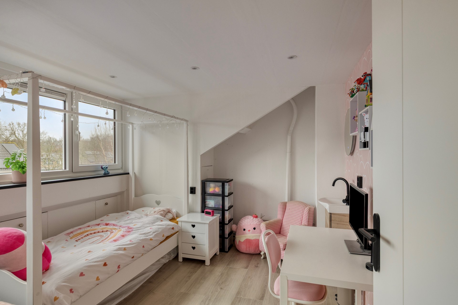 Een vaste trap brengt u naar de tweede verdieping, waar een ruime overloop met dakramen direct opvalt door de hoeveelheid daglicht. Hier vindt u de opstelling voor witgoed, de cv-installatie en extra bergruimte achter de knieschotten. Daarnaast is er een volwaardige vijfde slaapkamer gerealiseerd. De dakkapel is voorzien van geïntegreerde rolluiken en ook hier zorgt de airconditioning voor een aangenaam klimaat, zowel in de zomer als in de winter. Deze verdieping leent zich uitstekend voor een tienerkamer, werkruimte of multifunctionele invulling.