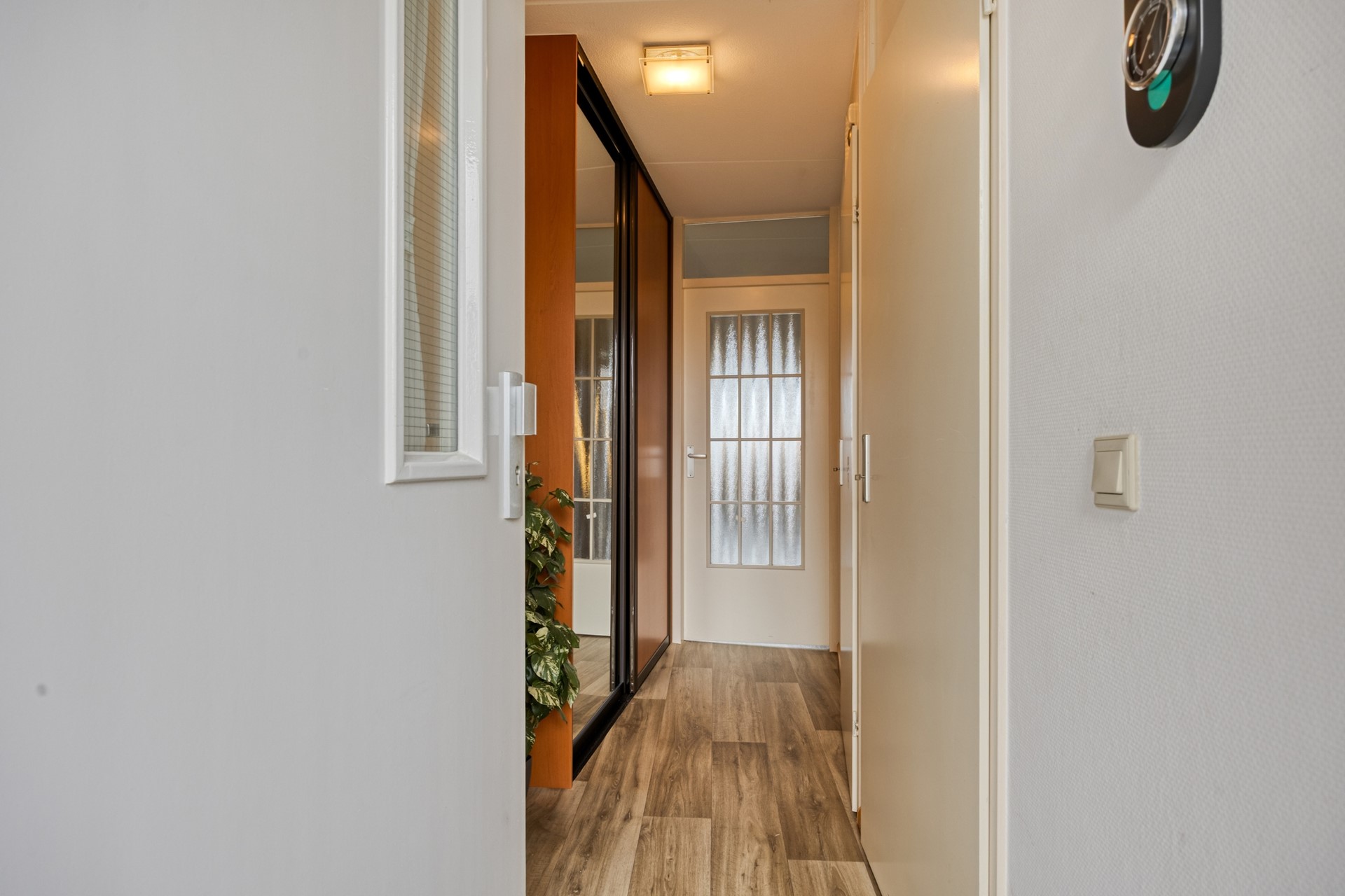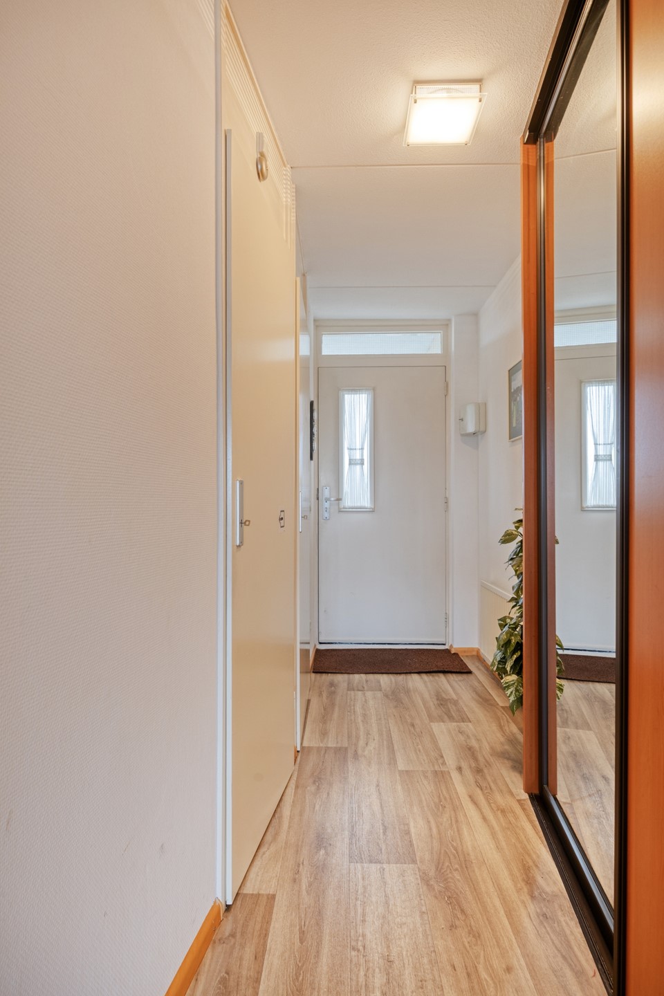 Binnenkomst in de hal met een nette afwerking en een doorlopende vloer die direct een rustige basis geeft. De hal is uitgerust met een praktische kast met schuifdeuren, ideaal voor extra bergruimte.