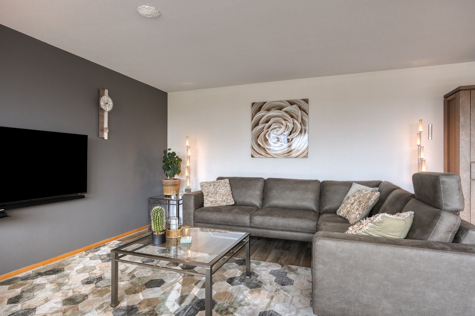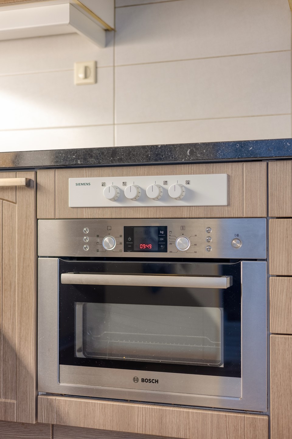 De woonkamer ligt aan de achterzijde van het appartement en is breed opgezet, waardoor er voldoende plek is voor zowel een sfeervolle zithoek als een ruime eettafel bij het raam. De grote raampartij over de volle breedte zorgt voor veel lichtinval en maakt het balkon/-dakterras een verlengstuk van de leefruimte. De vernieuwde keuken ligt centraal en is uitgevoerd in een moderne hoekopstelling met voldoende kastruimte en contrasterend werkblad. Alle benodigde apparatuur is aanwezig, waaronder een inductiekookplaat, combi-oven, vaatwasser en koelkast.