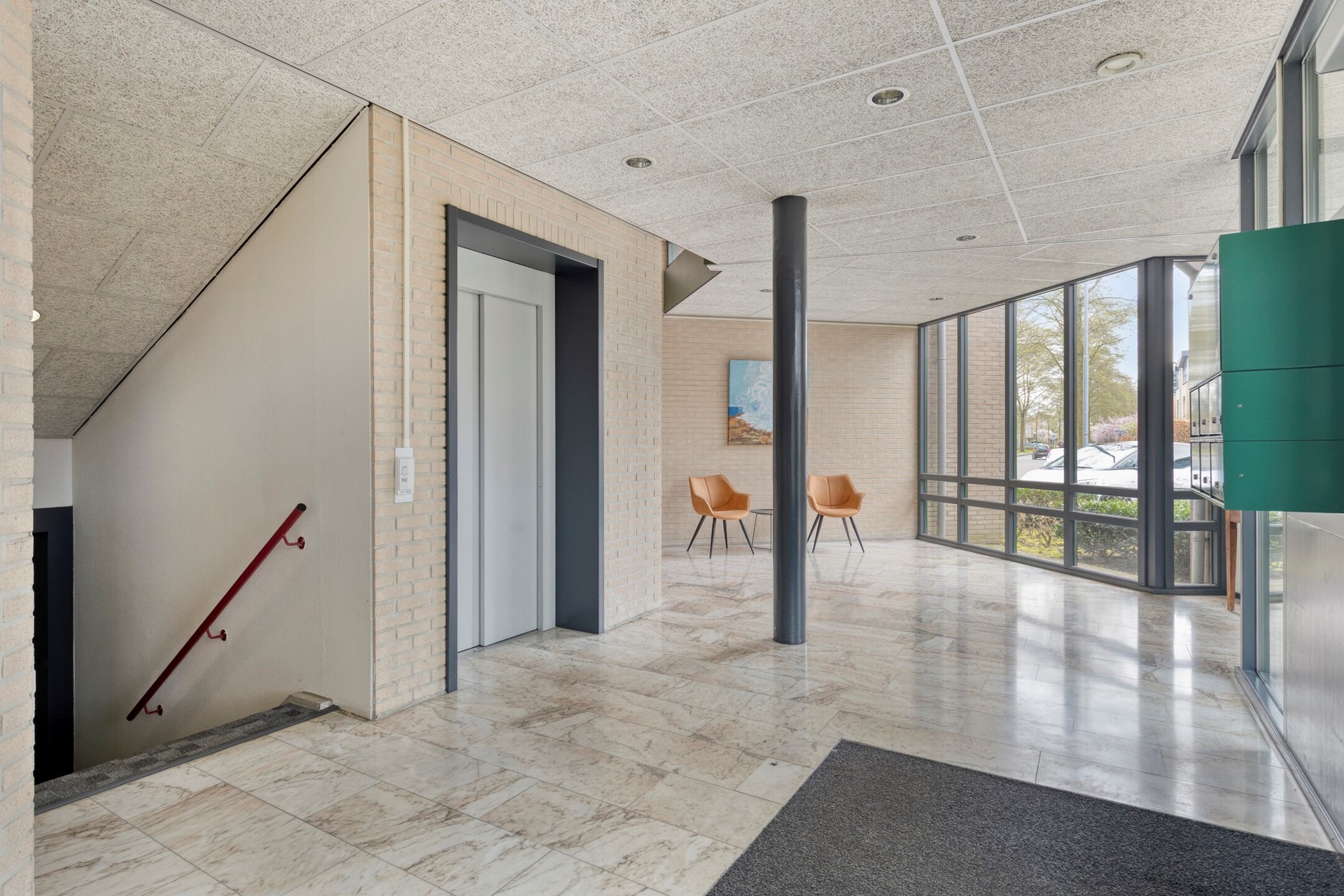 U betreedt het complex via de gezamenlijke entree aan de straatzijde, waar de brievenbussen en intercominstallatie zich bevinden. Vanuit de nette ontvangsthal kunt u met de lift naar de verdieping van het appartement te gaan.