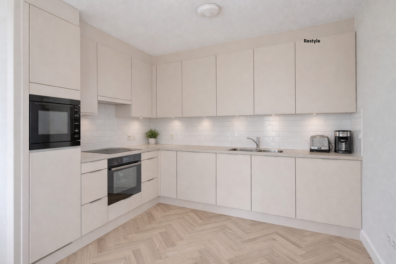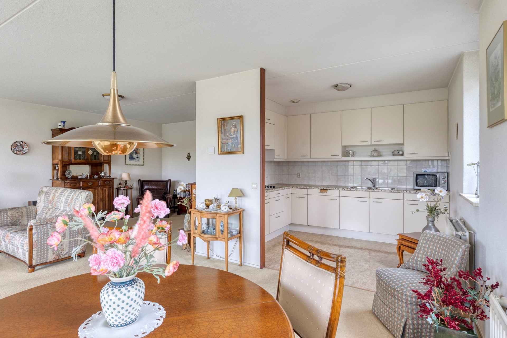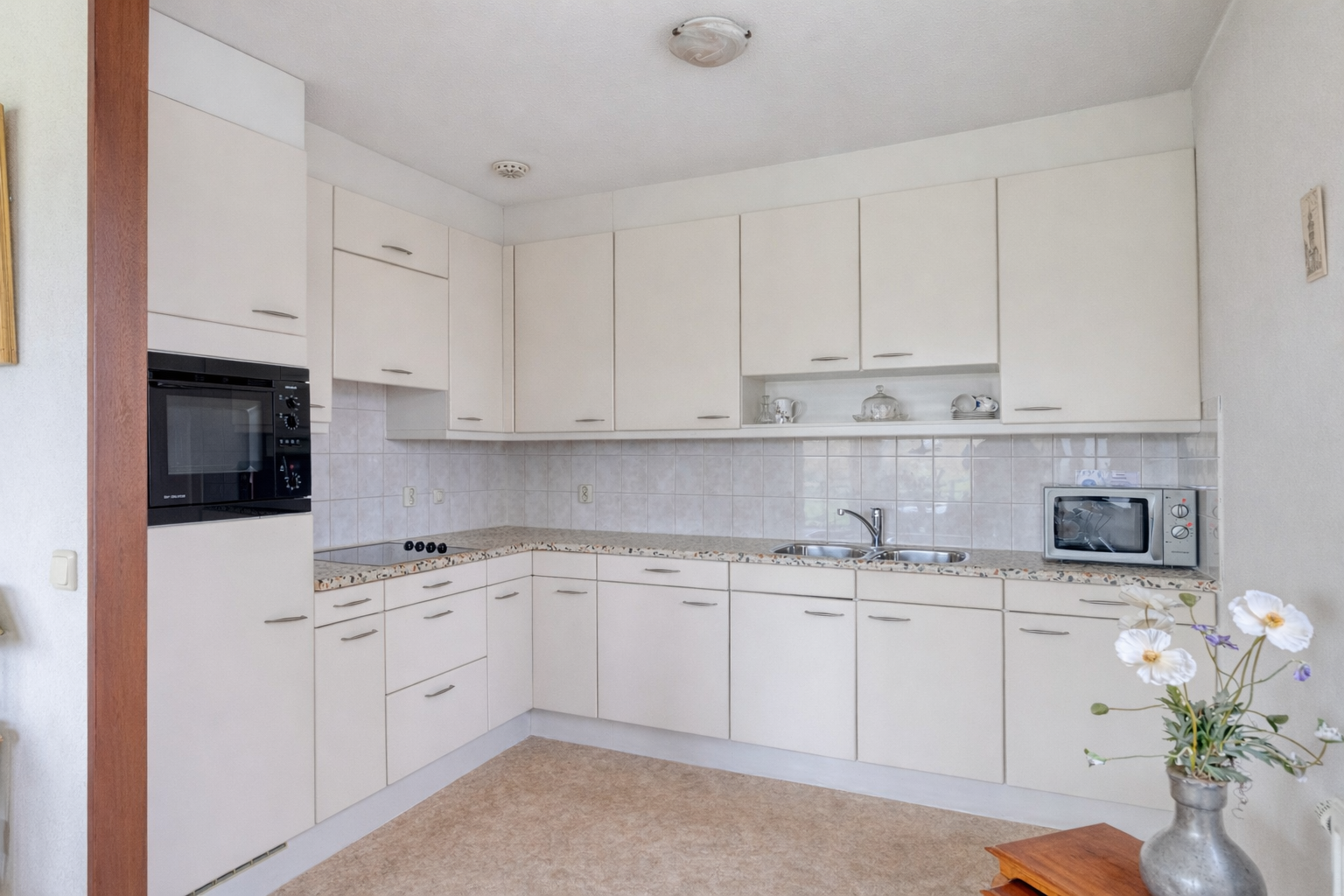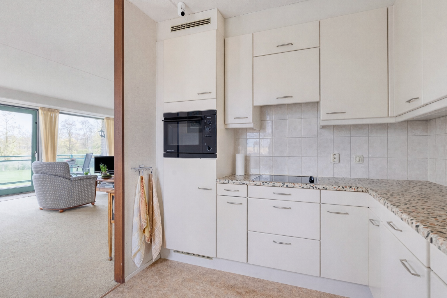 De open keuken sluit naadloos aan op de woonkamer en is uitgevoerd met een praktisch L-vormig aanrecht. U beschikt hier over een inductiekookplaat, spoelbak, ingebouwde ovencombinatie, vaatwasser en koelkast, evenals voldoende opbergruimte in de aanwezige lades en kastjes. De keuken is goed onderhouden en biedt u tegelijkertijd de mogelijkheid om deze naar eigen smaak te moderniseren.