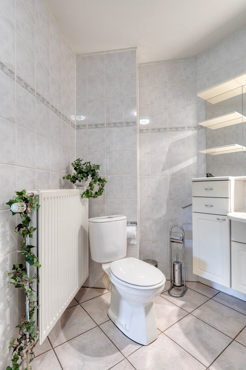 De betegelde badkamer is vanuit de hal toegankelijk en compleet uitgerust met een ruim ligbad, douchecabine, wastafel met opbergmeubel en een toilet. De ruimte is goed onderhouden en biedt u een comfortabele plek om te ontspannen. Daarnaast beschikt de woning over een separate toiletruimte, wat extra gemak biedt in het dagelijks gebruik.
